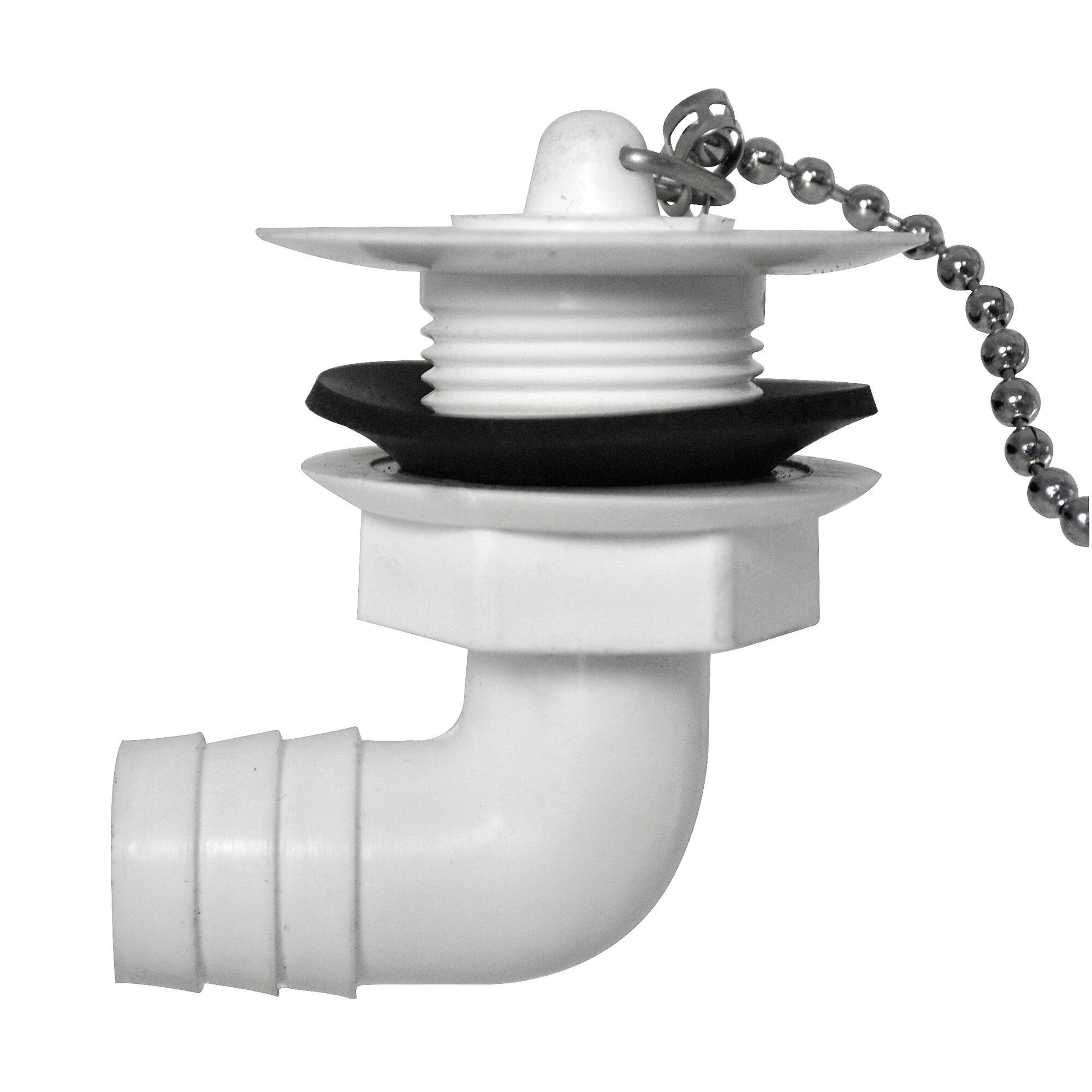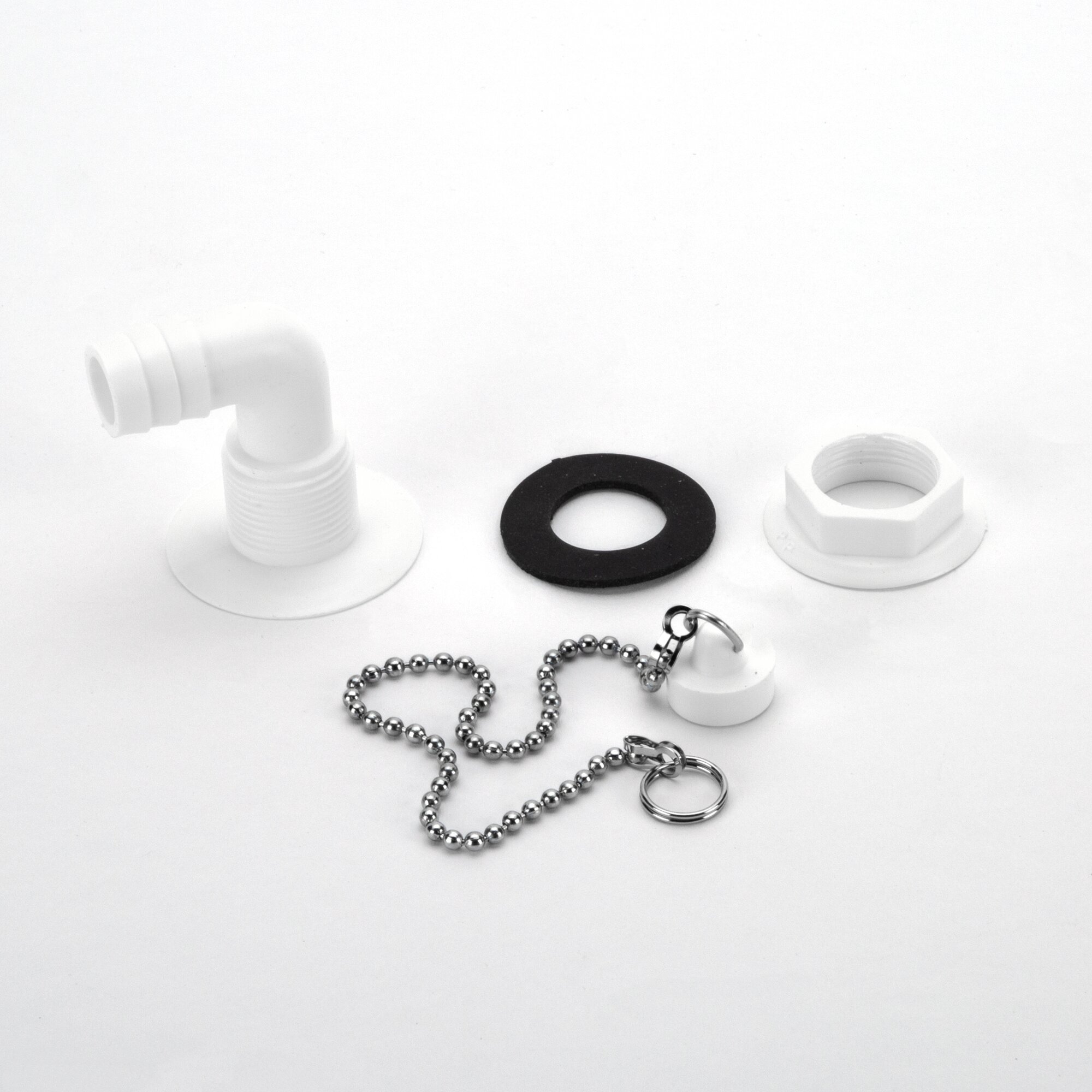 Komplett mit Stopfen, Kettchen und Dichtung. Schlauchanschluss ø 19 mm.