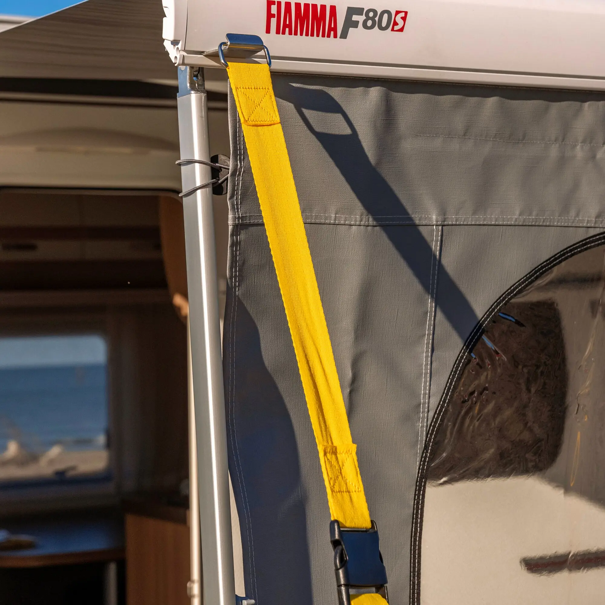 Das Tie Down S ist das ideale Abspannband für eine sichere und stabile Anbringung Ihrer Markisen F45, F65, F80 und Ihrer Privacy-Seitenteile. Es wird vorne in die Frontblende gespannt oder mit der Schnalle an den Seitenwänden des Privacy Rooms befestigt. Lieferumfang: 2 Spannbänder (je 3 m), 2 Erdnägel, 2 Spannfedern, 2 Frontblendenhaken (für F45, F65, F80 mit doppelter Kederschiene).