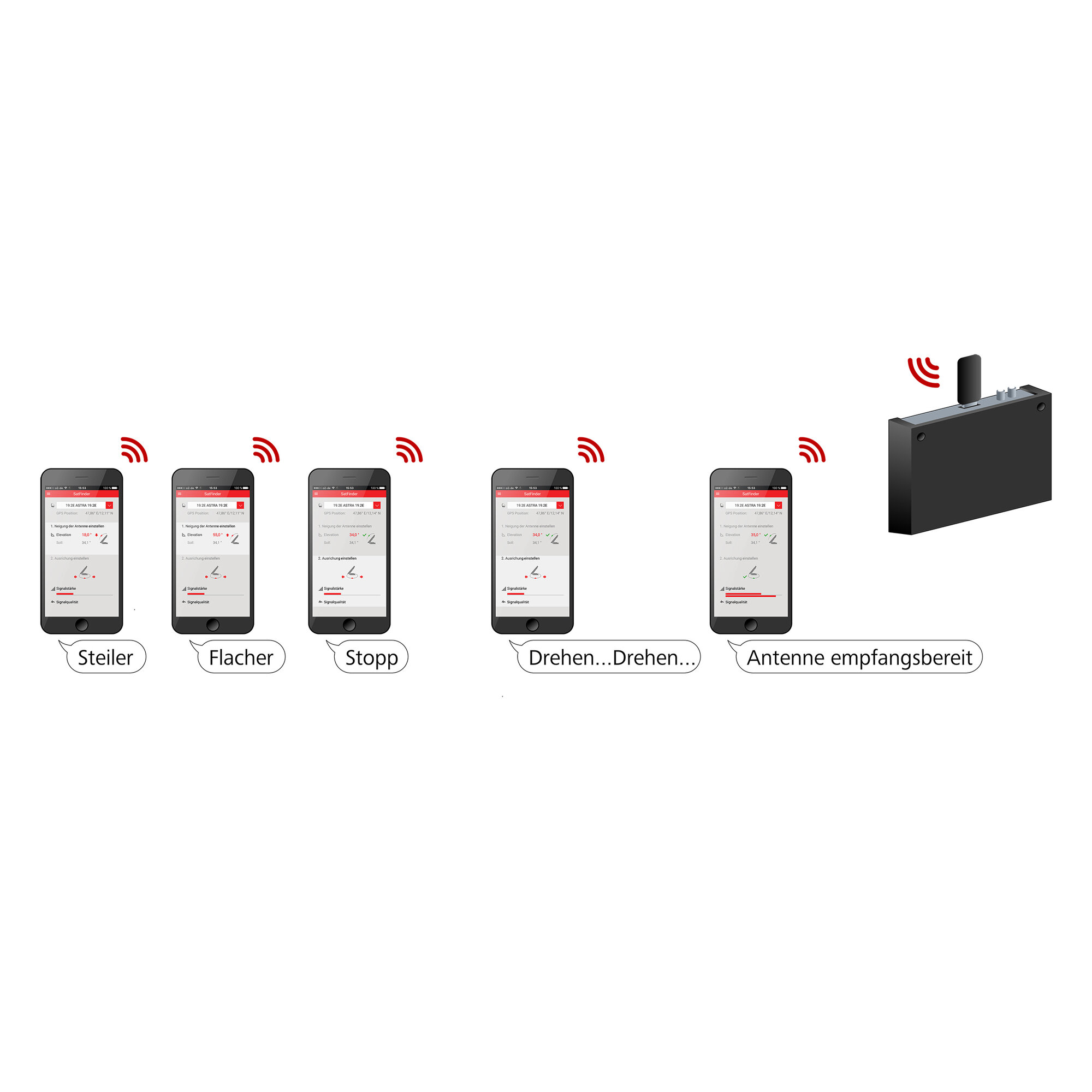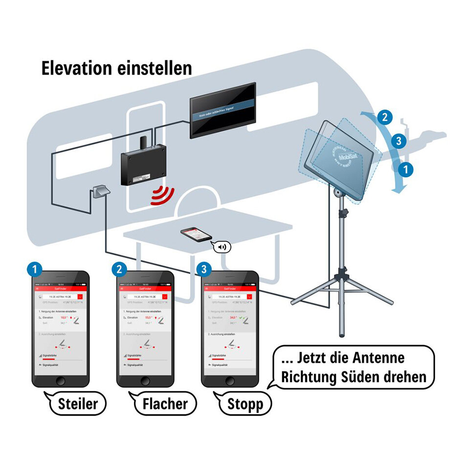 Die App „CAPcontrol“ (erhältlich für Android und iOS) gibt dir im Zusammenspiel mit CAP-Konverter und USB-WLAN-Adapter UFZ 132 akustische und visuelle Anweisungen, wie du die Sat-Antenne ausrichten musst: Zuerst stellst du den richtigen Neigungswinkel („Elevation“, Schritte 1 – 3) ein und danach den Drehwinkel („Azimut“, Schritte 4 – 5).