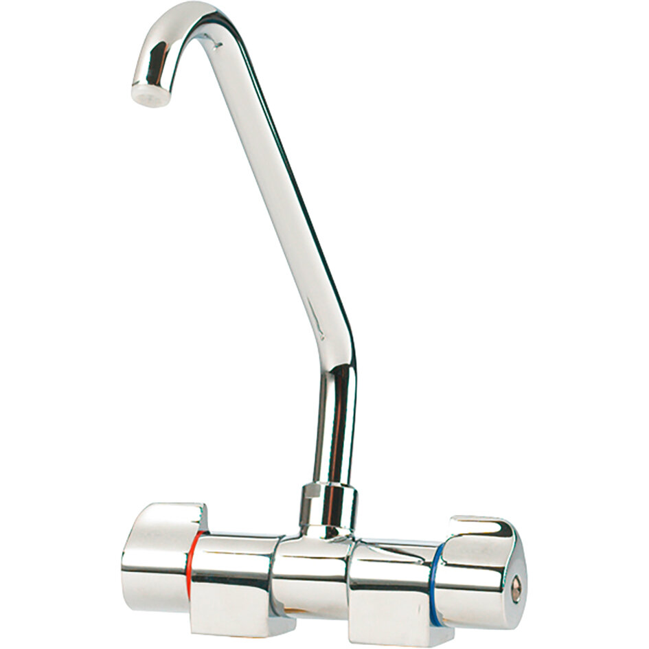 Zur Montage in der Arbeitsplatte neben der Spüle, Wasserhahn abklappbar, mit Zweigriff-Mischer für warmes und kaltes Wasser, Material Messing.
