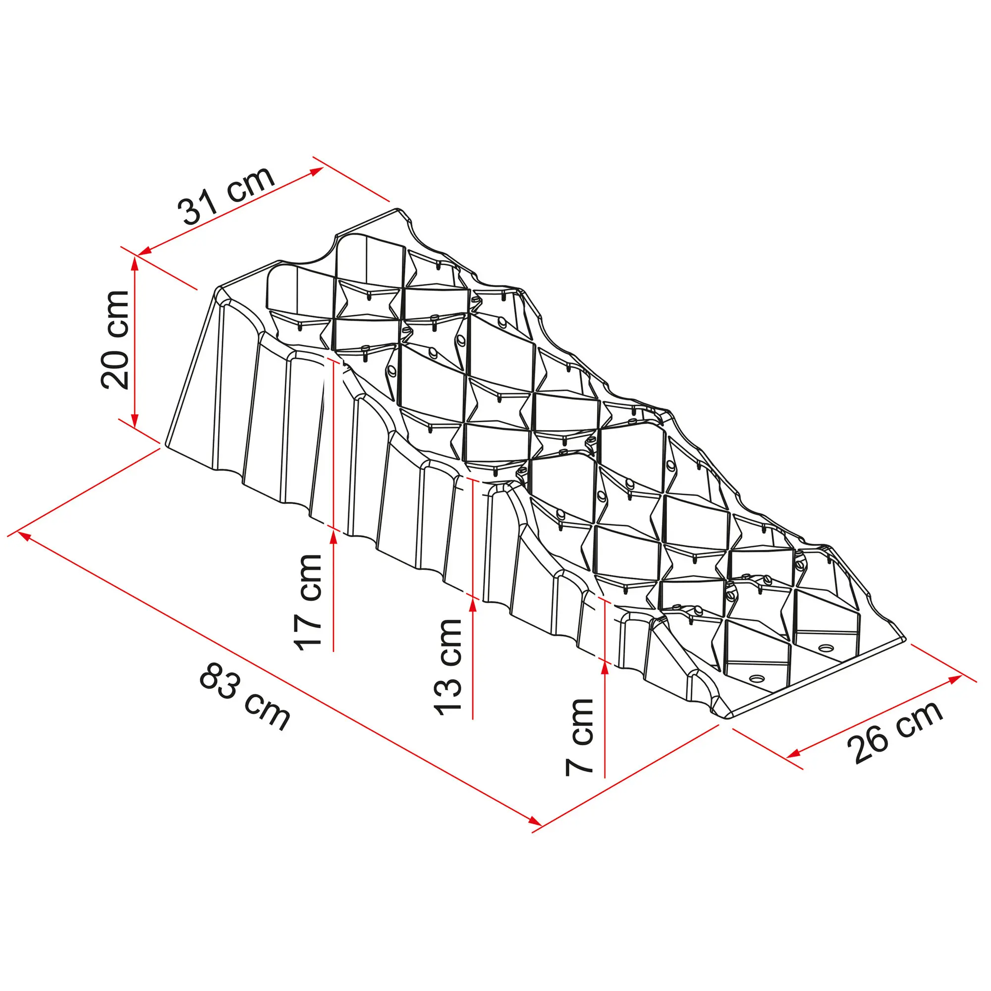 Das Hochleistungs-Stufenkeilsystem für alle Reisemobiltypen, mit drei Stufen auf 7, 13 und 17 cm Höhe. Die neue, überarbeitete Struktur sorgt für eine hohe Traglast und Anpassungsfähigkeit auf unebenem Gelände. Dank des praktischen Handgriffs auf der Rückseite kannst du den Stufenkeil bequem transportieren. Aus stabilem Polyethylen HD, UV-beständig.