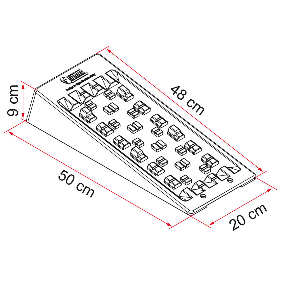 Verhindert zuverlässig die Nachteile einer Schräglage. Rutschfeste, an den Reifen haftende Oberfläche. Leicht, korrosionsfrei, schnell zu reinigen und splitterfrei. Beständig gegenüber UV-Strahlung. Stapelsystem mit selbstblockierender Einrastung zur Höhenverstellung.