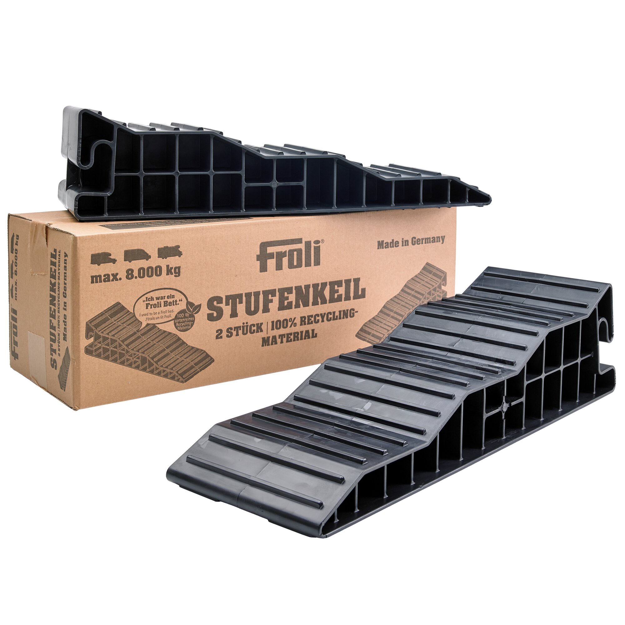 Aus 100 % Recyclingmaterial (TPE-E). Mit drei Stufenhöhen (45, 75 und 105 mm) und einer geprüften Stützlast von 2000 kg pro Rad.