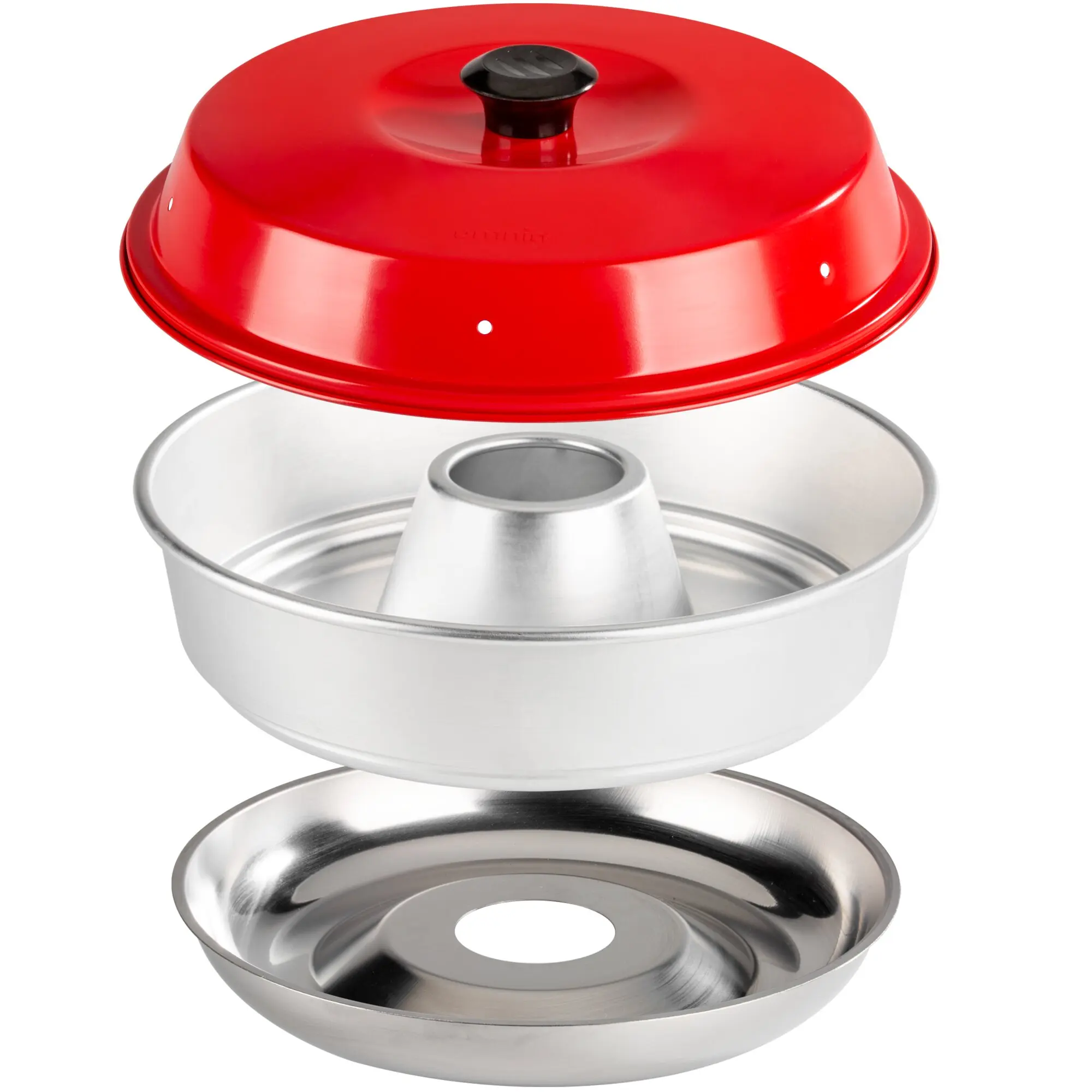 Das 3-teilige Omnia Backofen Set besteht aus einer Aluminiumform im Gugelhupf-Design, einem speziell angepassten Untergestell aus Stahl und einem Deckel mit Ventilationslöchern und guter Höhe. Dieser ermöglicht sogar das Backen von aufgehenden Speisen wie Brot und Kuchen.