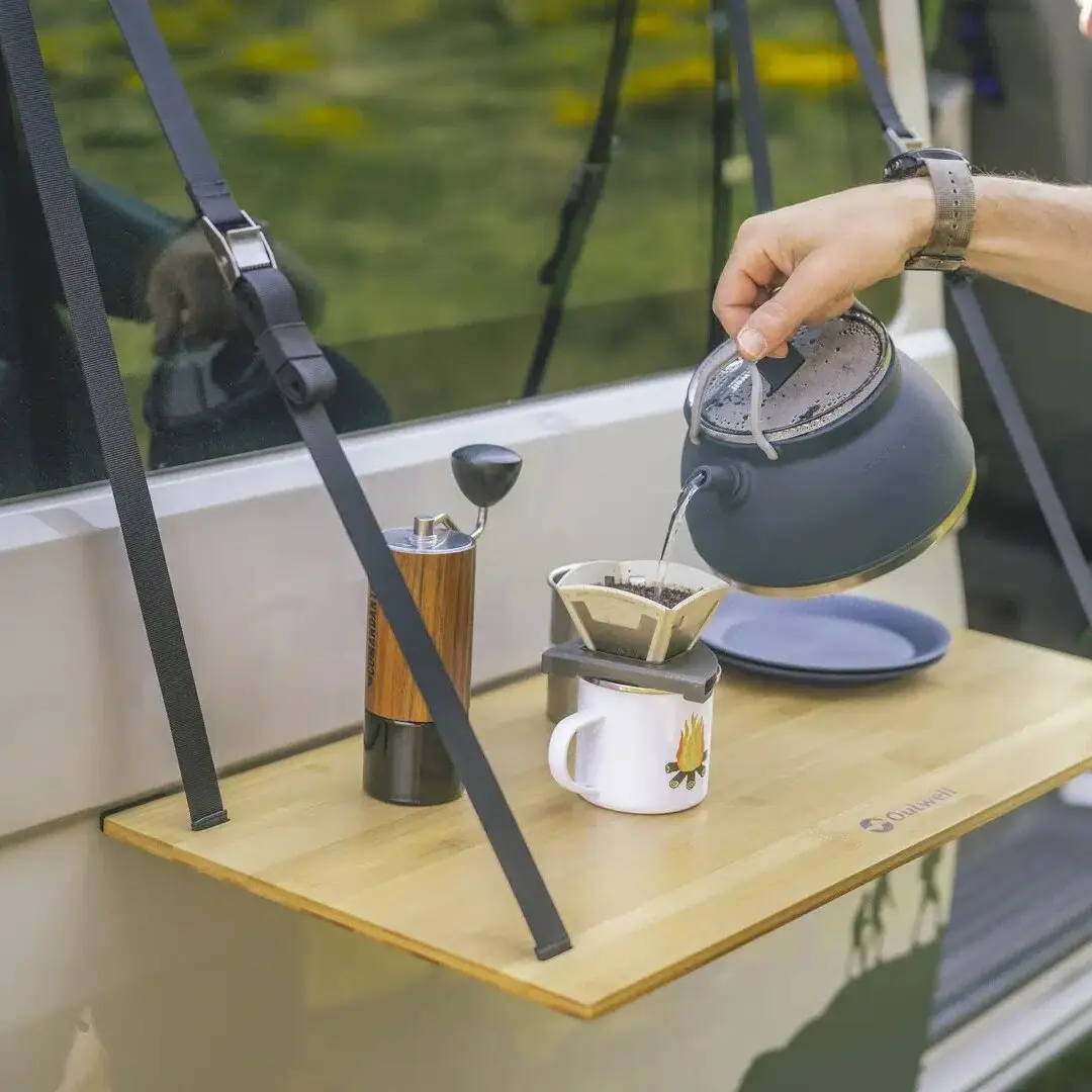 Der Bambus-Tisch zum Einhängen für die Van-Schiebetür bietet eine praktische und stilvolle Lösung, um im Van zusätzlichen Platz zu schaffen. Die stabile Tischplatte überzeugt durch natürliche Optik, geringes Gewicht und angenehme Haptik. Sie lässt sich schnell montieren und platzsparend verstauen.