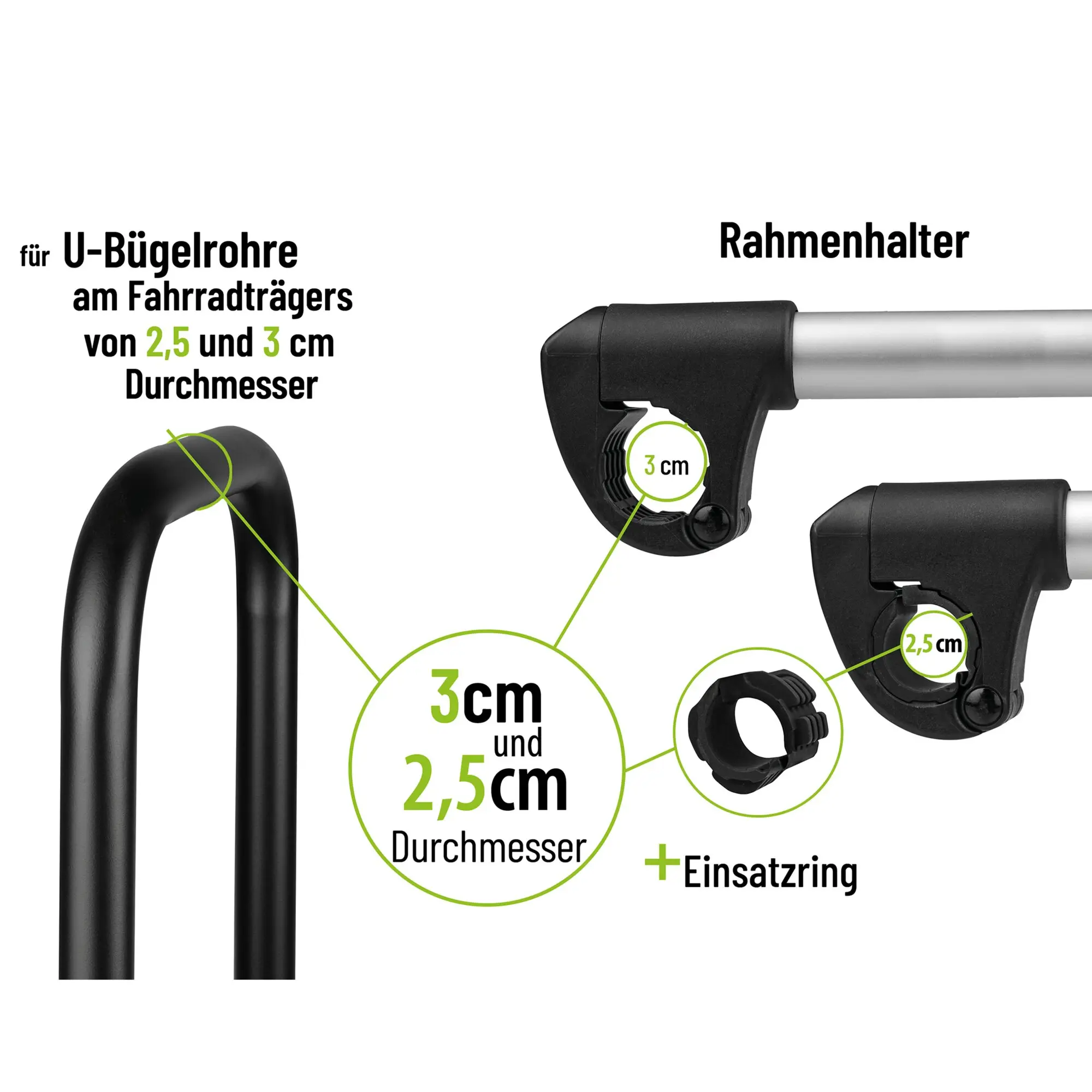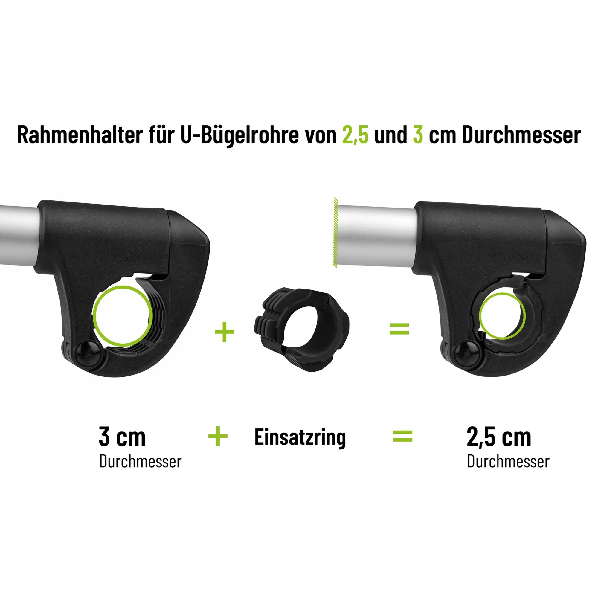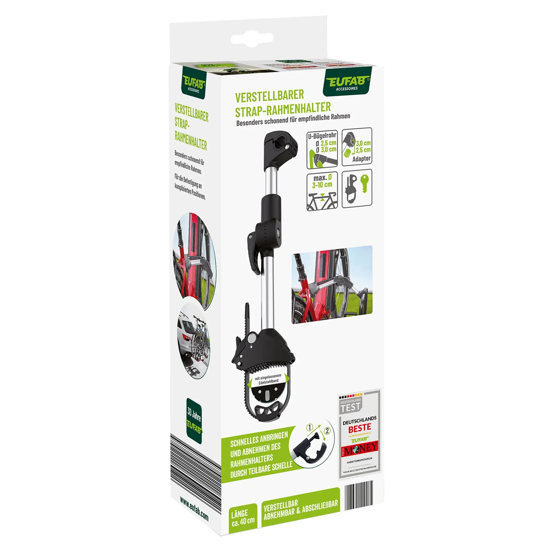Die Befestigungskralle mit Strap wurde speziell für U-Bügelrohre (ø 2,5 – 3 cm) entwickelt. Das arretierbare Drehgelenk ermöglicht die Montage auch an komplizierten Stellen. Dank der teilbaren Schelle lässt sich der Rahmenhalter schnell anbringen und abnehmen. Passend für alle EUFAB Fahrradträger und viele andere Modelle (bitte Durchmesser beachten). Geeignet für Fahrräder mit Rahmendurchmessern von 3 bis 10 cm. Ideal für schnelle und sichere Befestigung.