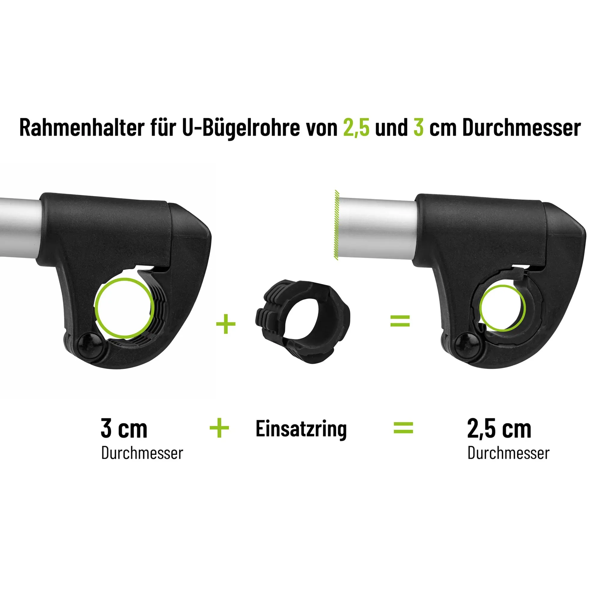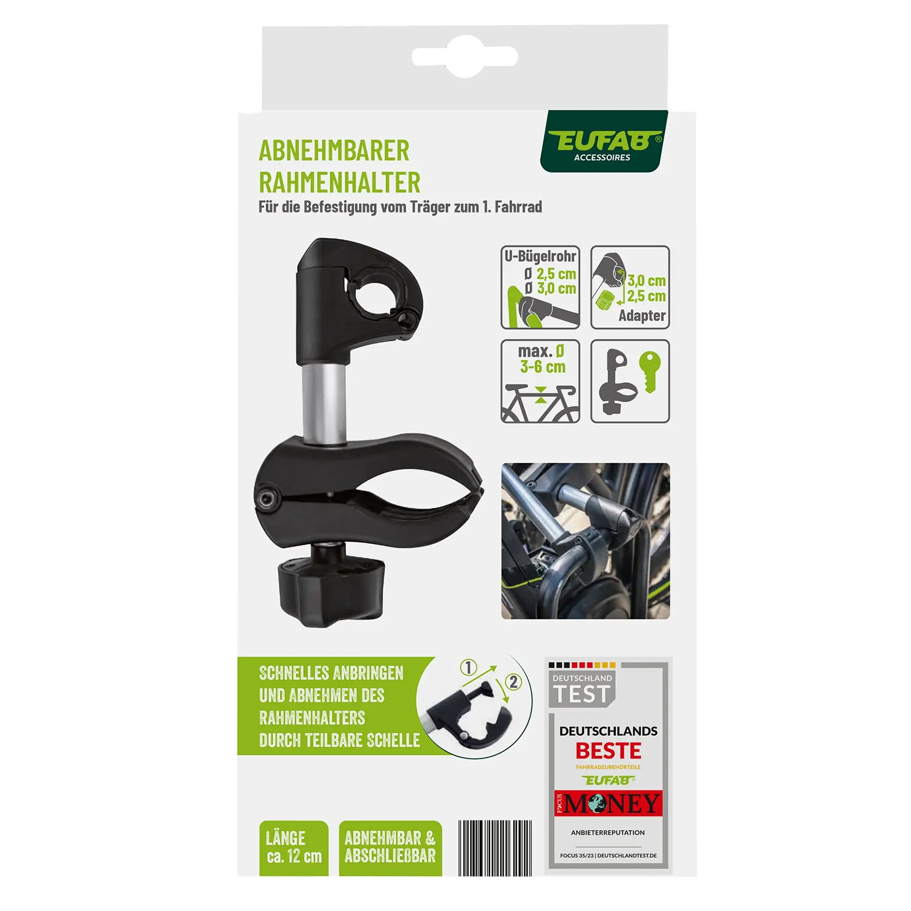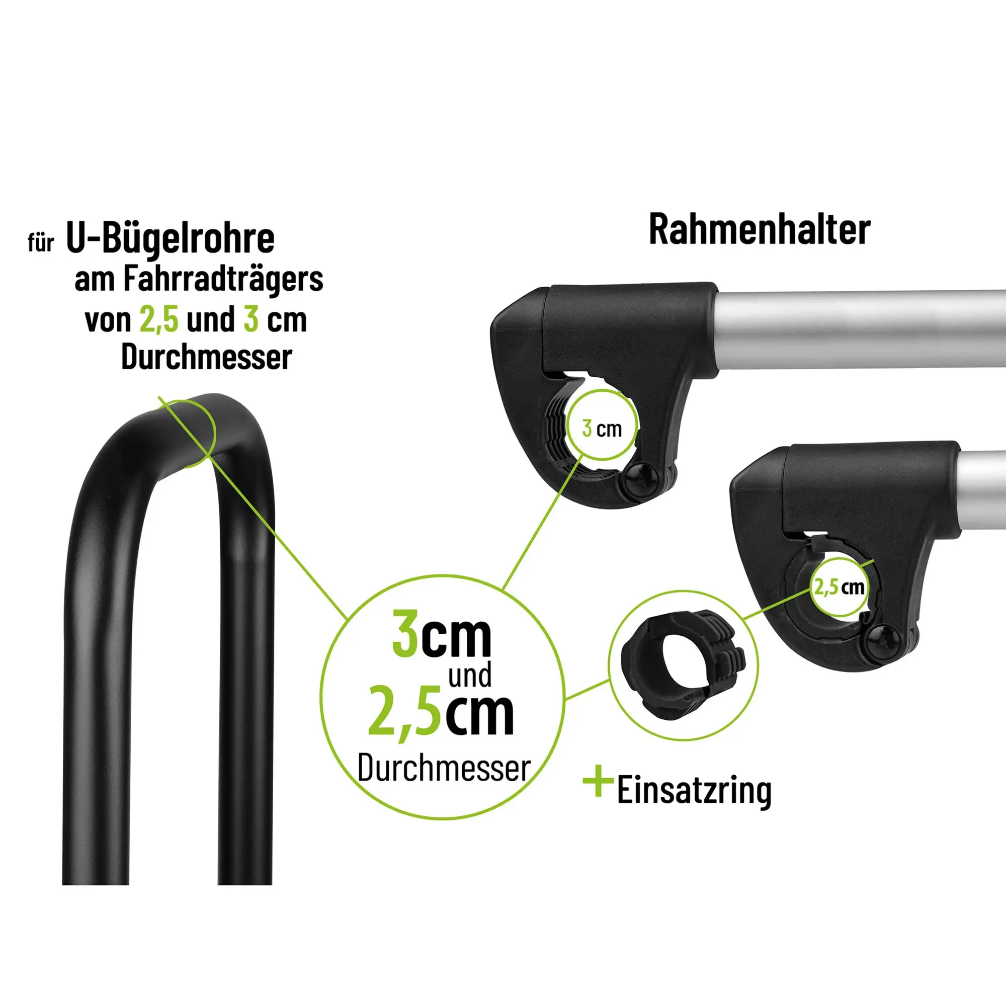 Für alle EUFAB Fahrradträger Modelle. Auch für andere Fahrradträger-Marken geeignet (Rahmendurchmesser beachten). Rahmendurchmesser des Fahrrads von 3 – 6 cm.