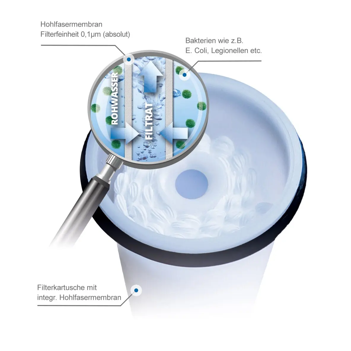 Kompakt und steril. Entfernt rein physikalisch Krankheitserreger wie Bakterien, Pilze etc. zu nahezu 100 %. Bakteriologischer Rückhalt: > 99,9999 %. Kapazität (abhängig von der Rohwasserqualität): ca. 2000 bis 5000 l. Durchfluss: ca. 7 l/min bei 3 bar.