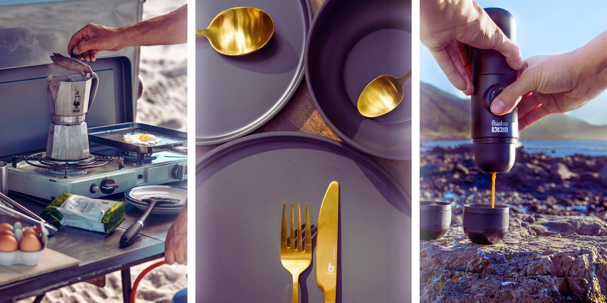 Du wachst nach einer langen Nacht erstaunlich erholsam im Wohnmobil auf. Eigentlich bist du ja nicht so der Campingtyp, aber er möchte dir diese Welt näherbringen. Du wirfst dir deine Shorts und ein Shirt über und öffnest die Wohnwagentür. Geräusche von brutzelnden Spiegeleiern, der Duft von Kaffeepulver und der Anblick seines umwerfenden Lächelns begrüßen dich. „Guten Morgen Schönheit“, sagt er, während er auf dem Cadac 3 Pro Deluxe Wasser kocht und Spiegeleier brät. Grinsend setzt du dich an den überraschend stilvoll gedeckten Tisch. Sogar goldenes Besteck und modernes Geschirr hat er mit hierhergebracht. Vielleicht kann Camping doch ganz schön sein, denkst du, als er das kochende Wasser in die Nanopresso füllt und euch einen unglaublich leckeren Espresso kreiert. Tiefenentspannt genießt ihr euer Frühstück in der Sonne – mit rosaroter Brille und dem perfekten Koffeinkick.