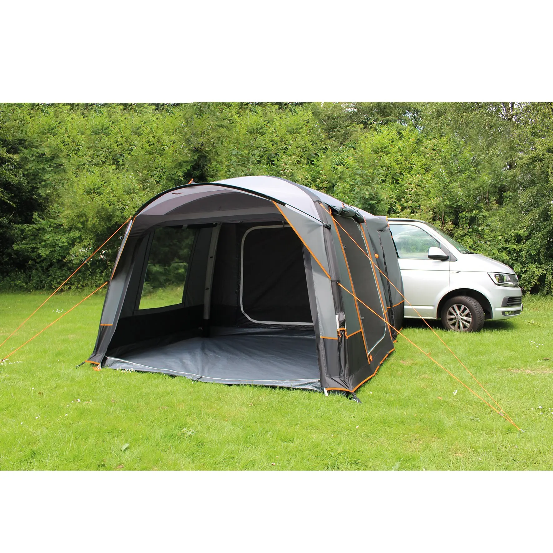 Freistehendes Busvorzelt mit praktischem Vordach über dem Eingang. Für ein gutes Klima sorgen viele Ventilationsmöglichkeiten im Zelt. Das San Marino Air Busvorzelt hat verschiedene Verbindungsmöglichkeiten zum Fahrzeug: mit 7 mm Keder, Schleusenstab oder mit Klettband an der Reling. Das Portofino RV Air ist mit 6+7 mm Keder ausgestattet, der mittels Reißverschluss entfernt werden kann.