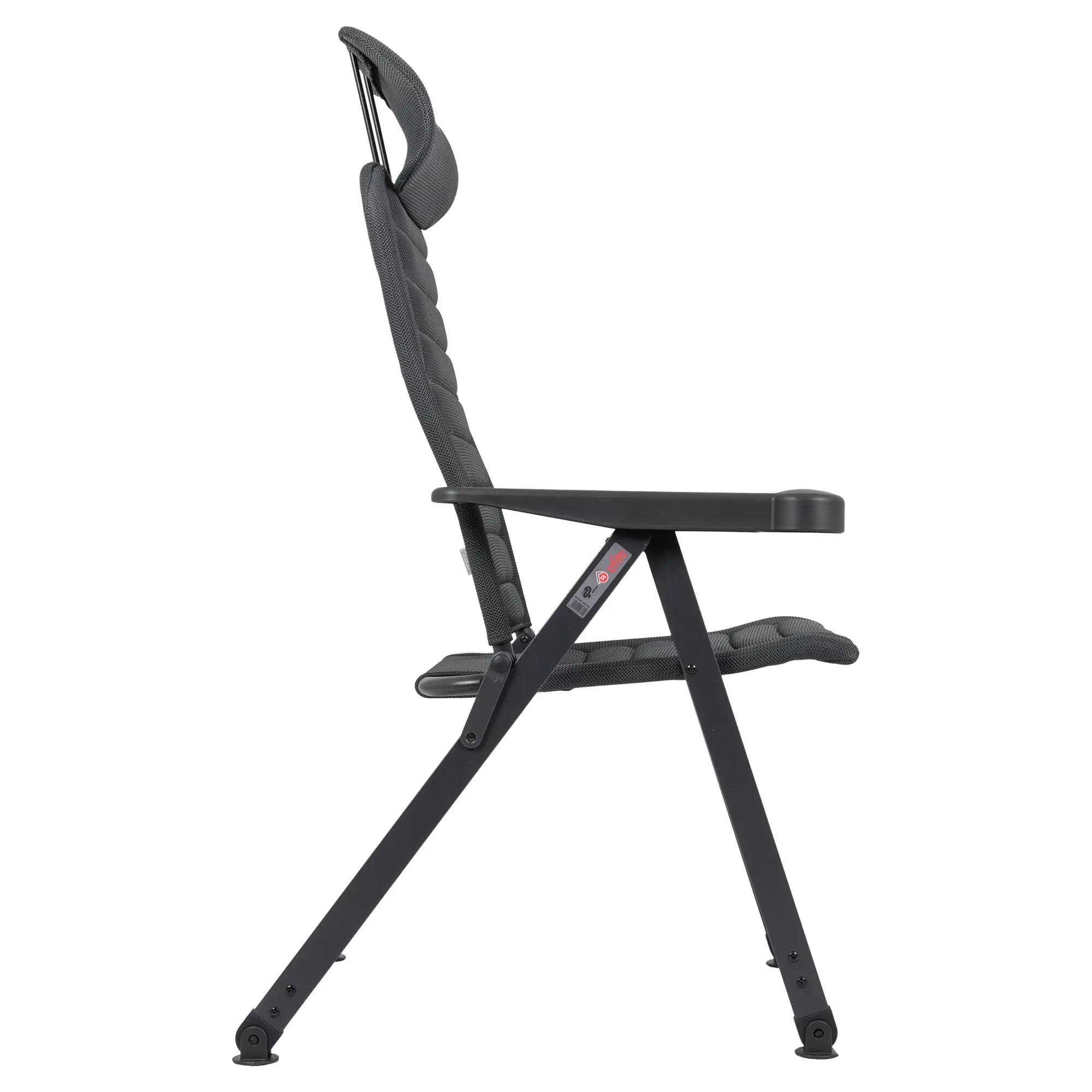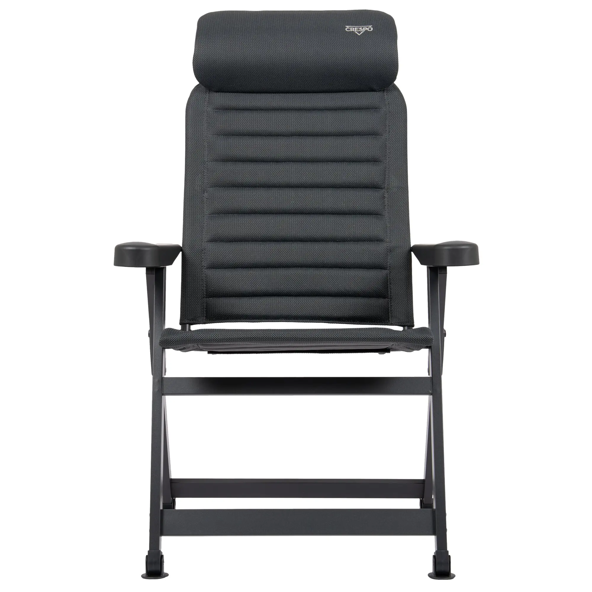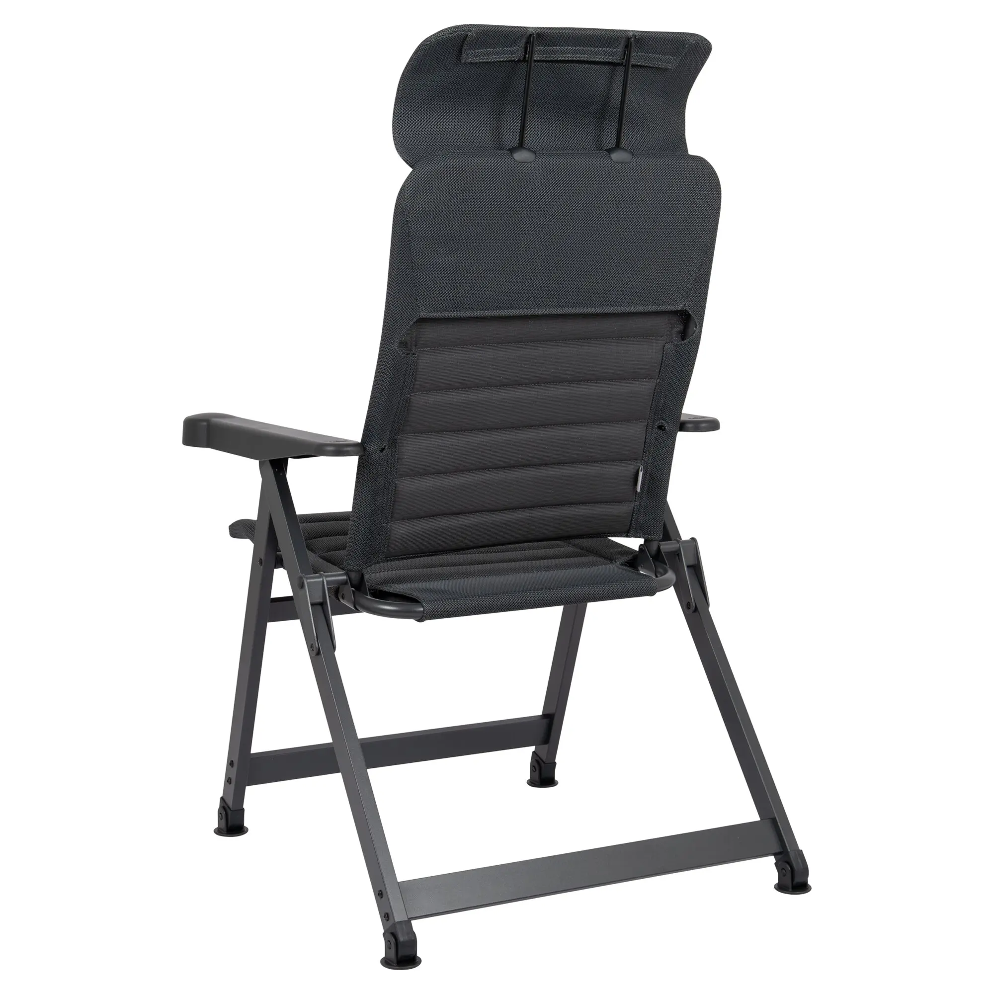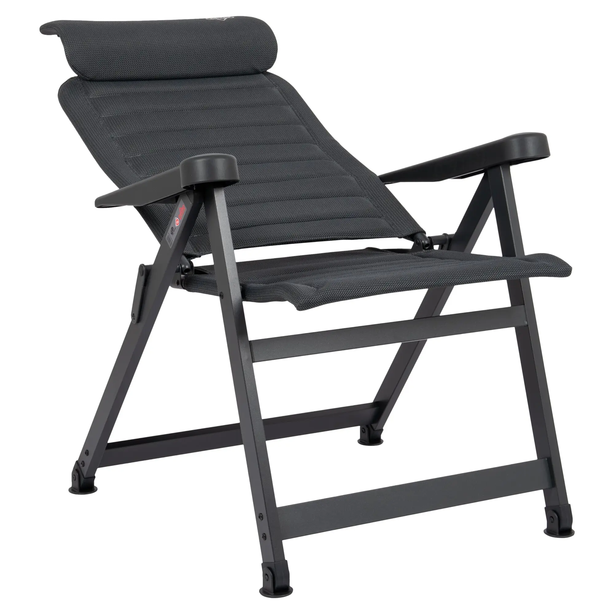 Ergonomischer Campingstuhl mit 7-fach verstellbarer, kürzerer Rückenlehne, eloxiertem H-Rahmen mit Stabilisierungsfüßen und verstellbarer Kopfstütze. Schnelltrocknend dank atmungsaktiver Polsterung.
