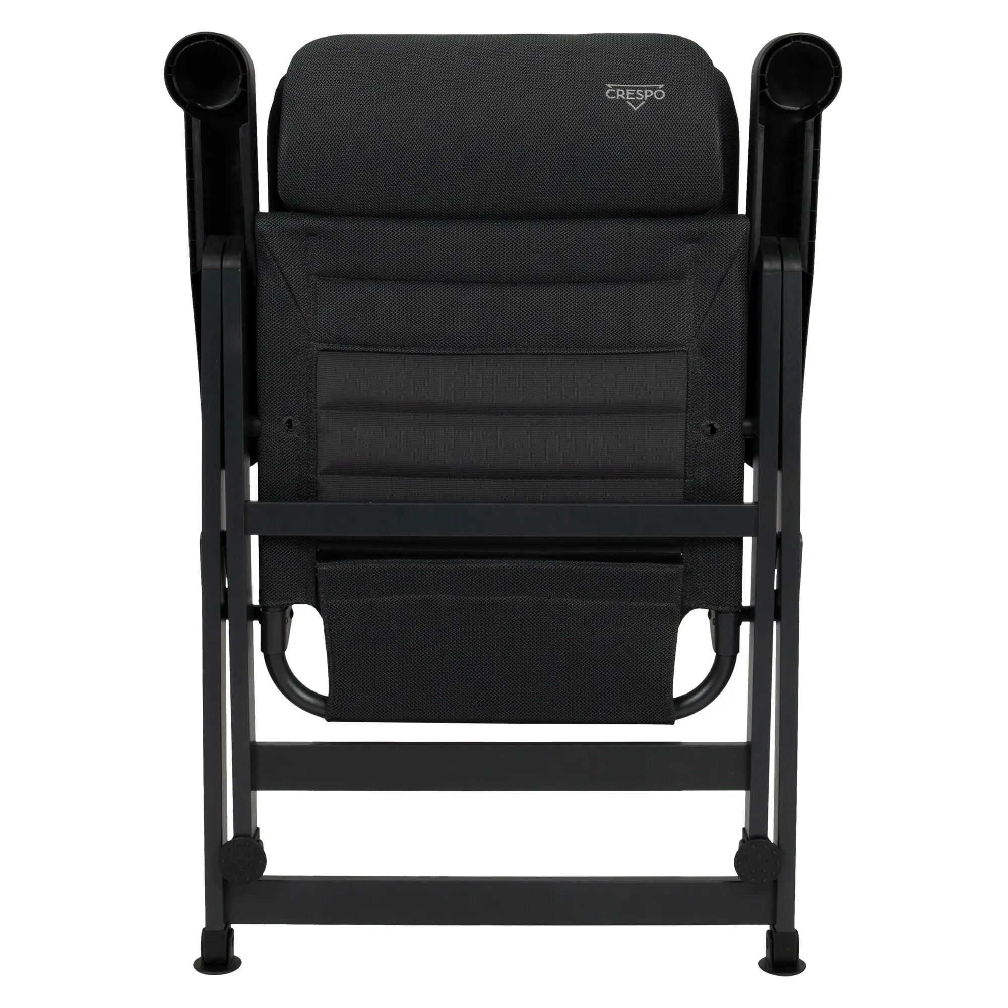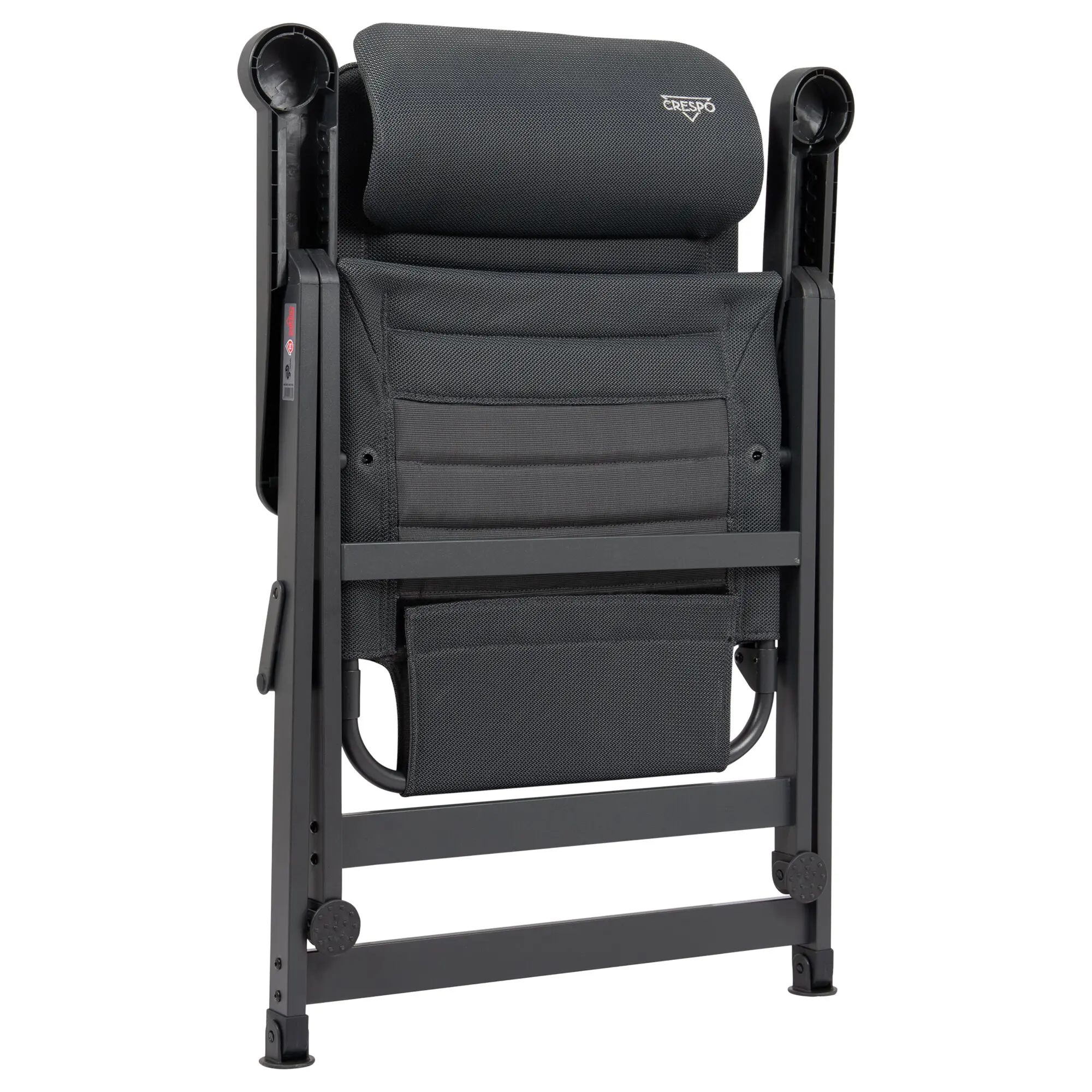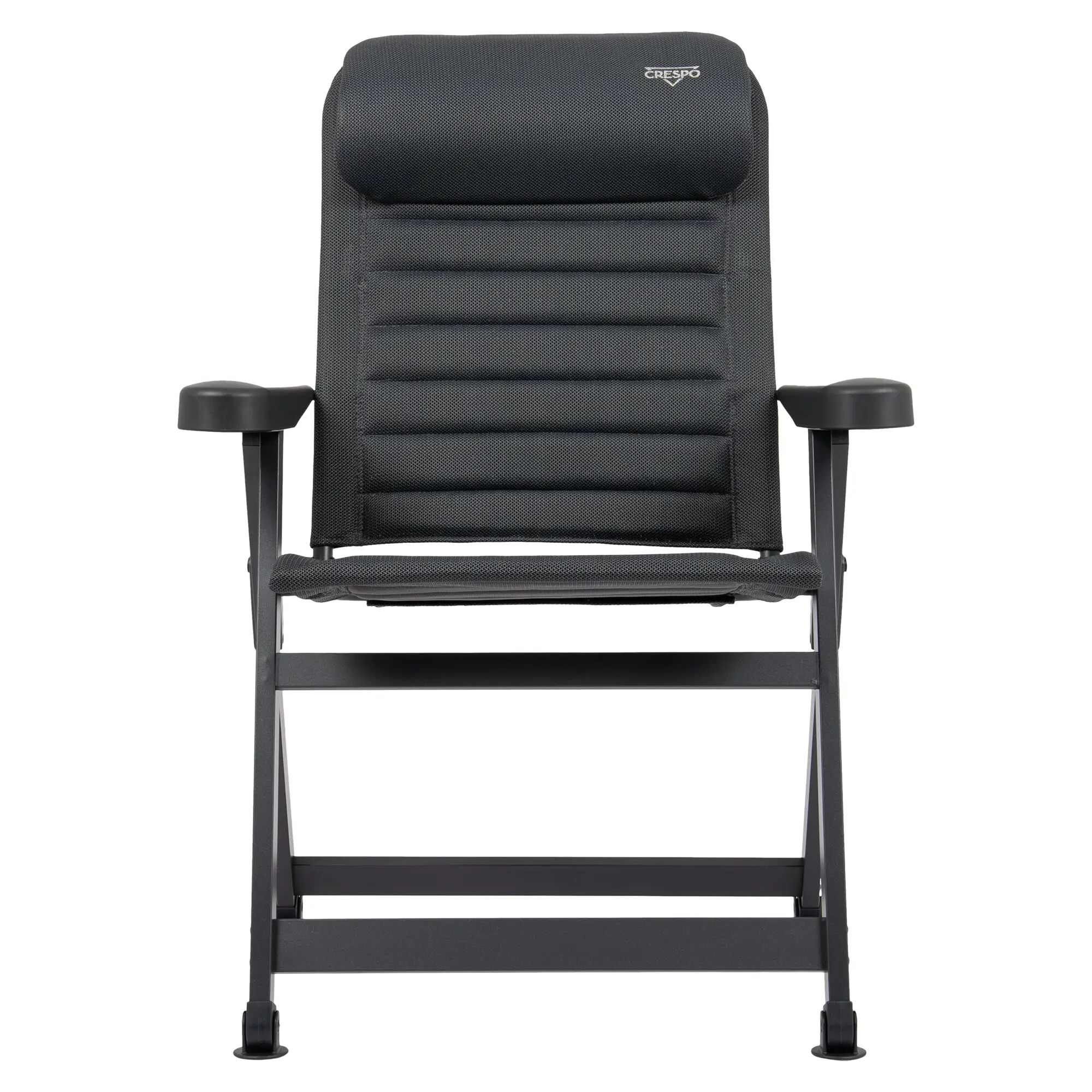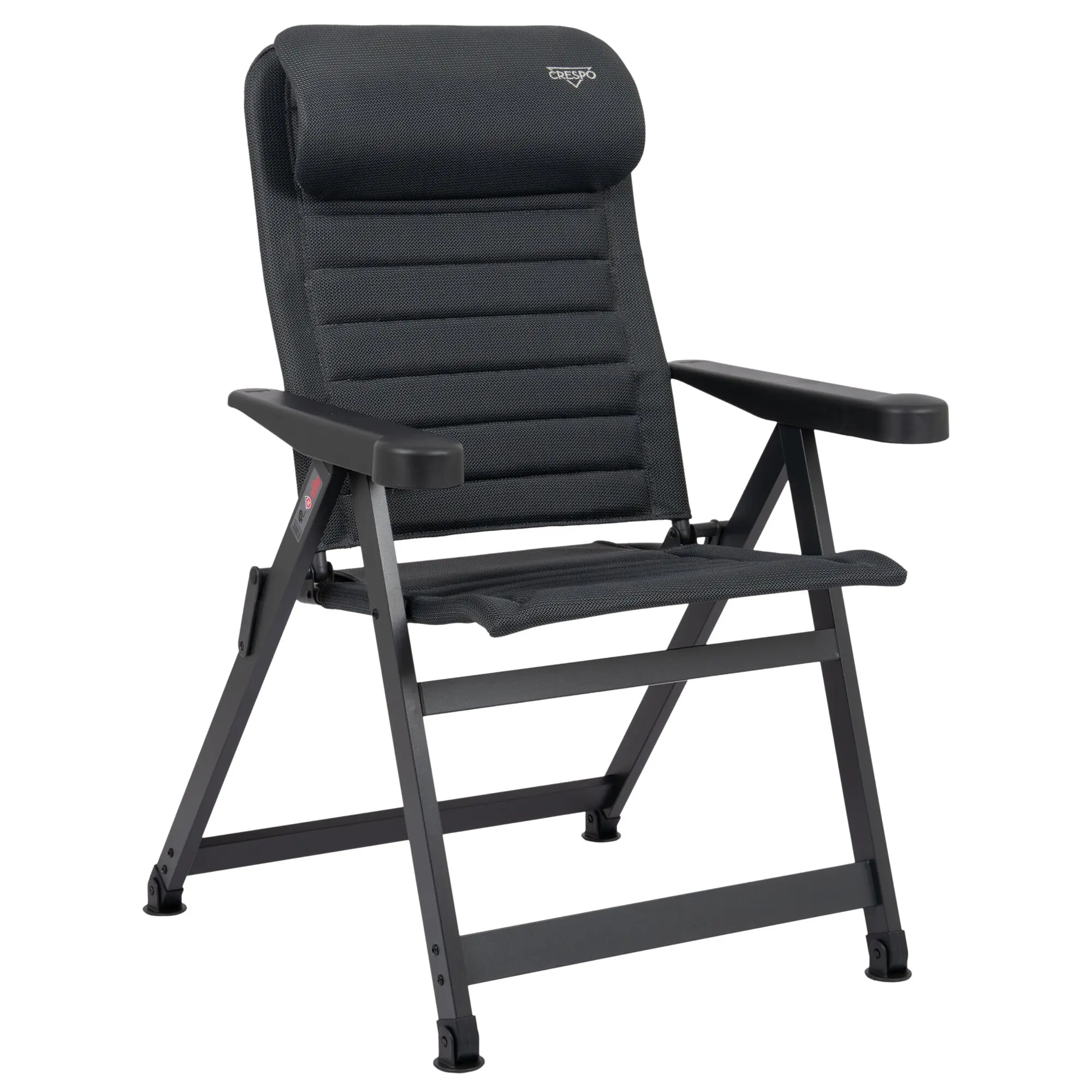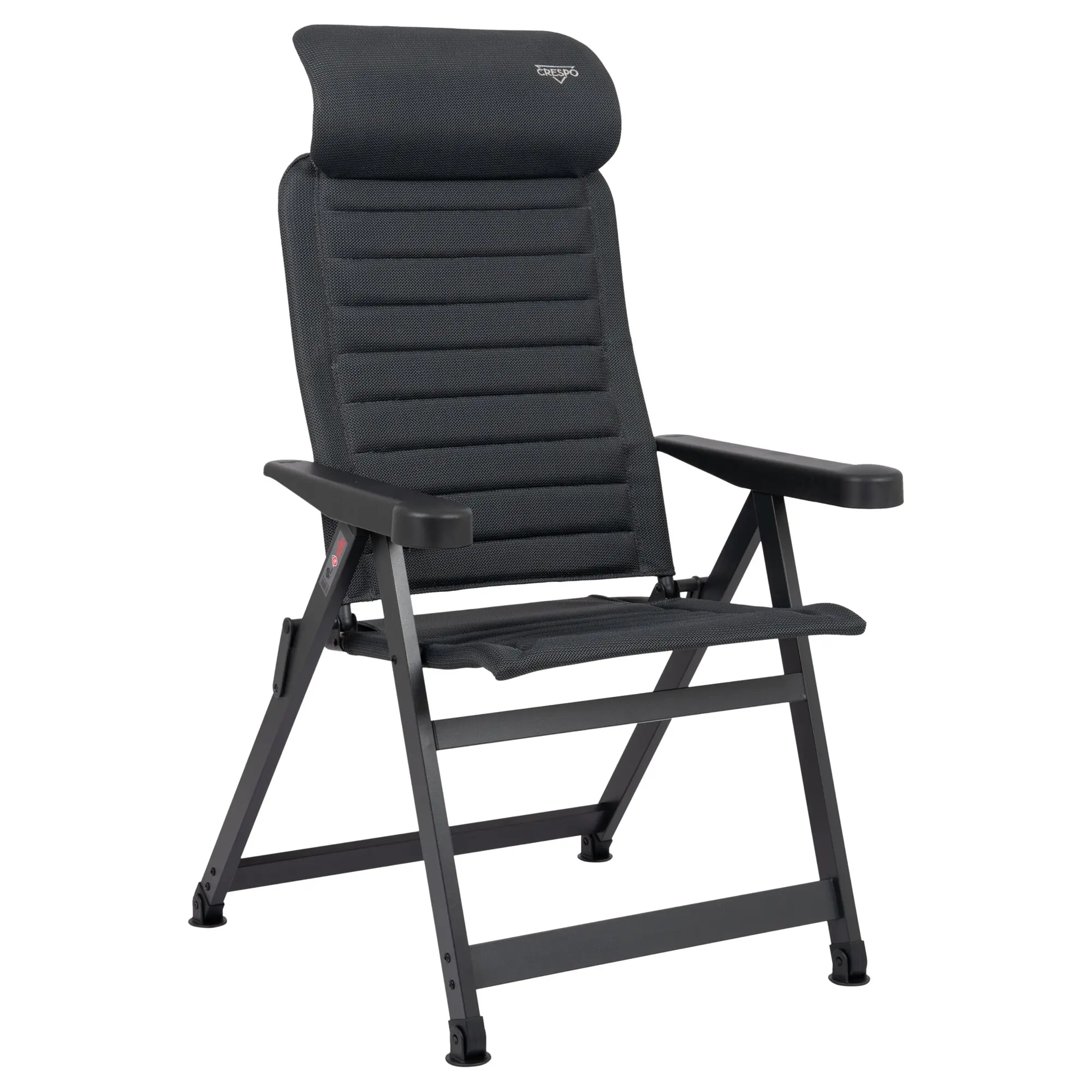Ergonomischer Campingstuhl mit 7-fach verstellbarer, kürzerer Rückenlehne, eloxiertem H-Rahmen mit Stabilisierungsfüßen und verstellbarer Kopfstütze. Schnelltrocknend dank atmungsaktiver Polsterung.