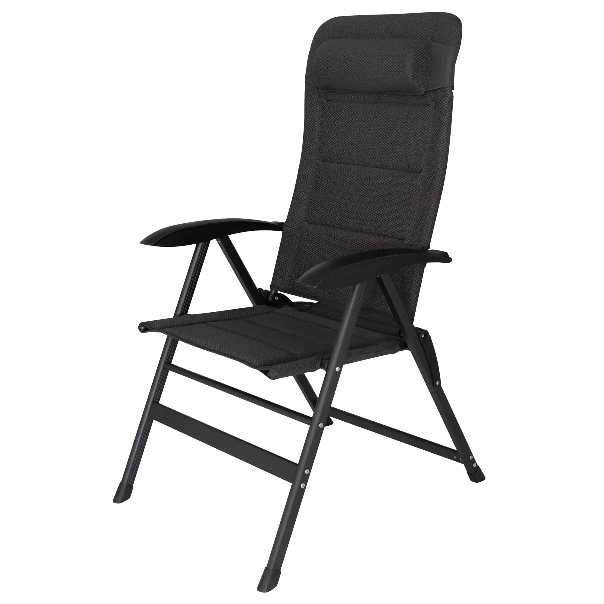 Bequemer Campingstuhl mit extrabreiter Sitzfläche und hoher Rückenlehne mit Kissen. Der verstärkte D-Rahmen aus Aluminium kann mit maximal 140 kg belastet werden. Der Stoff besteht aus gepolstertem Air-Mesh-Material und bietet Ihnen perfekten Sitzkomfort. Die Rückenlehne ist 6-fach verstellbar und hat eine verstellbare Kopfstütze. Eine Fußauflage ist optional erhältlich.