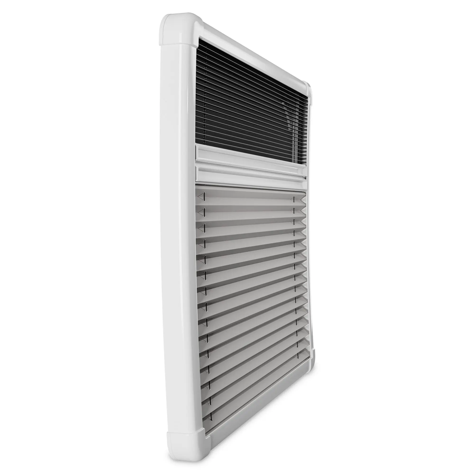 Diese Kombination aus einfach plissierter Verdunkelung und Fliegengitter ist speziell für den Einsatz mit Dometic S7P Fenstern vorgesehen. Die beiden Gitter können miteinander verbunden und mit nur einer Hand in die gewünschte Position gebracht werden.