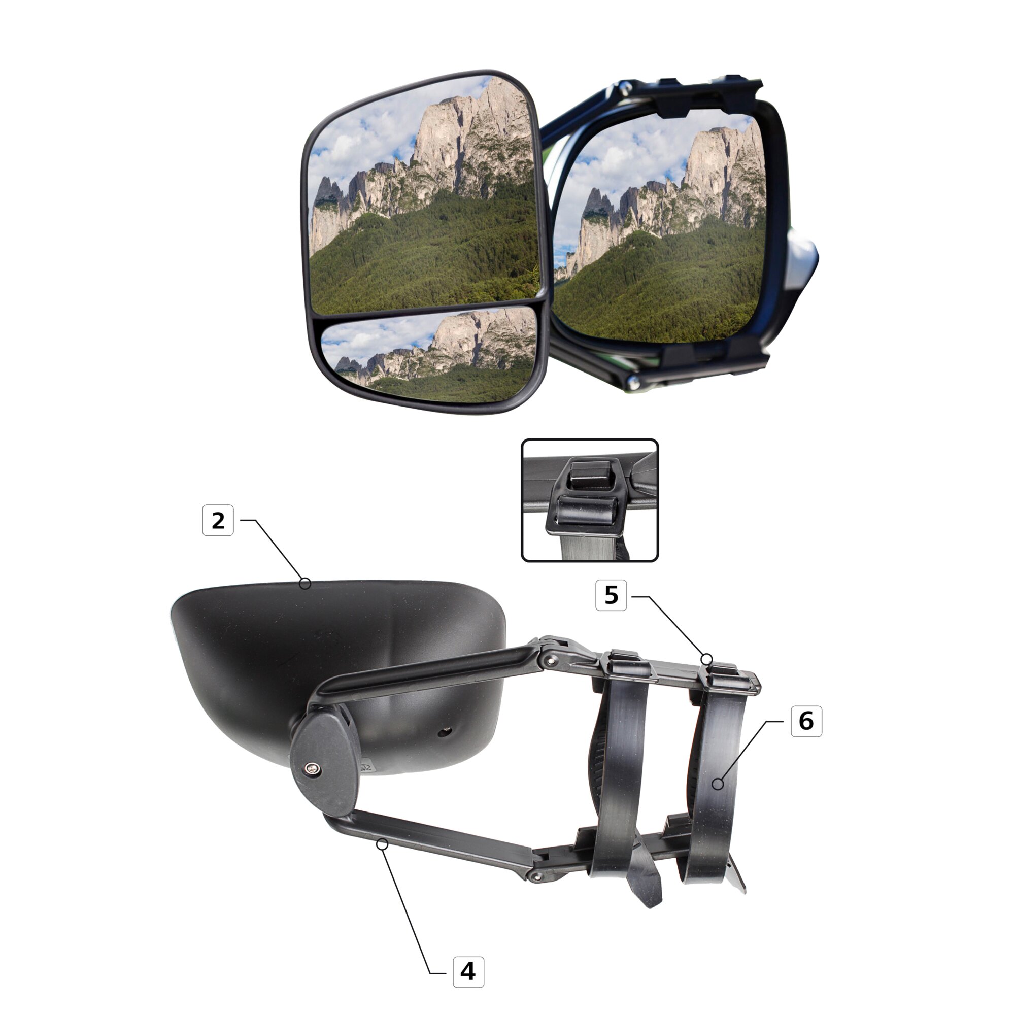 Aufsteckspiegel für die serienmäßig vorhandenen Autospiegel. Auch für größere Rückspiegel von SUVs, Kastenwagen oder kleineren Freizeitfahrzeugen geeignet. Einfache und schnelle Montage mittels hochwertiger Gummi-Spanngurte. Spiegelkopf mit integriertem Toter-Winkel-Spiegel. Fahrerseite: Planglas. Beifahrerseite: Konvexglas.