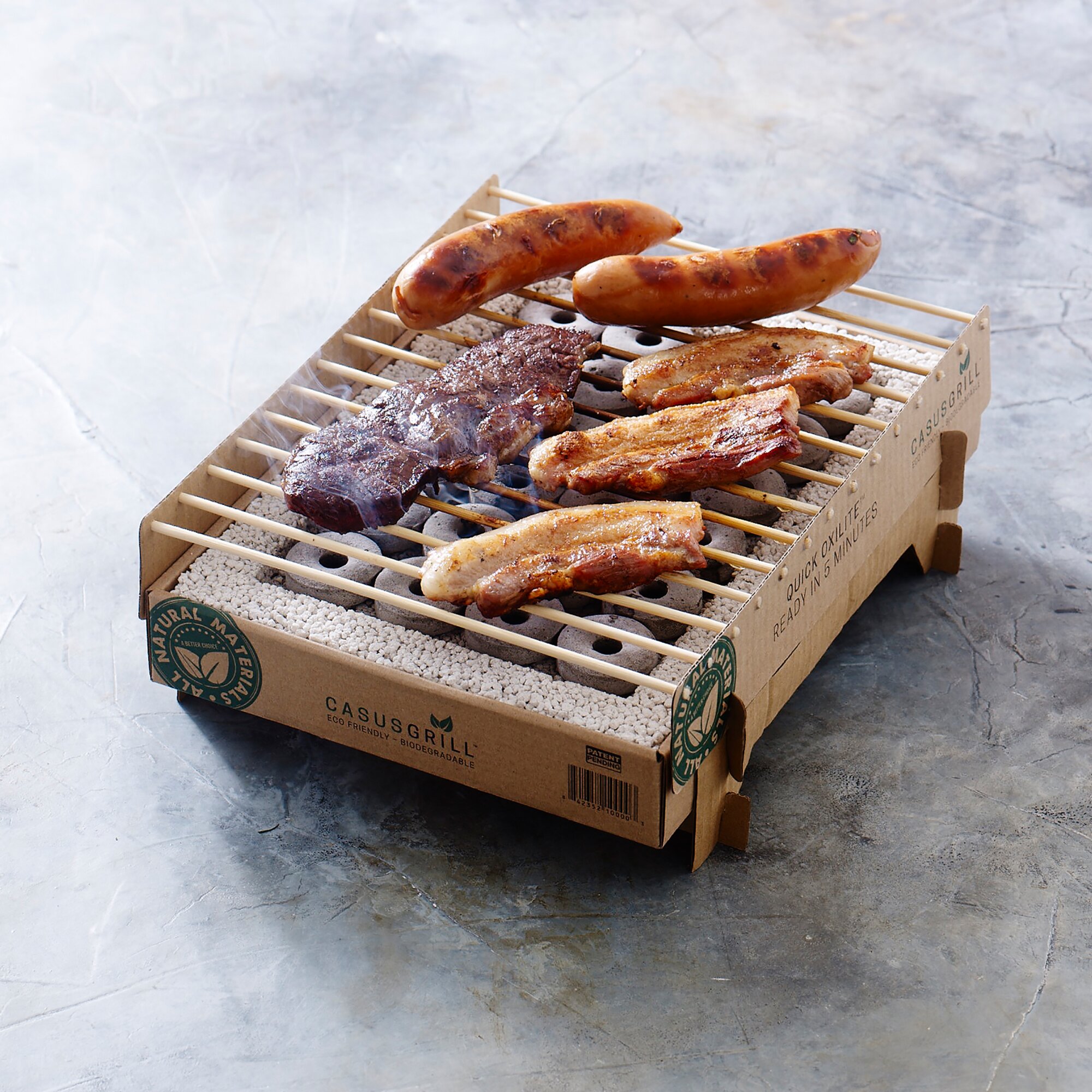 Der innovative, umweltfreundliche und vollständig entsorgbare Instant-Grill ist in nur 5 Minuten einsatzbereit und liefert eine Stunde lang Hitze. Dank seines Designs können Sie den Grill auch während des Grillens in der Hand halten. Der Grill besteht aus natürlichen Materialien. Daher können Sie ihn nach dem Gebrauch einfach im Müll, auf dem Kompost oder im Feuer entsorgen und Ihren ökologischen Fußabdruck reduzieren. Keine Aluminiumschalen mehr in Parks oder der Natur. Der mehrfach ausgezeichnete CasusGrill wird aus FSC-zertifiziertem Karton und natürlich vorkommendem Lavastein hergestellt. Der Grillrost besteht aus Bambus, der nicht brennt, und die Briketts bestehen aus Quick Oxilite™ Bambusholzkohle. Dieser Einweggrill verbraucht weniger Kohle und emittiert etwa 50 % weniger CO₂ als herkömmliche Einweggrills.