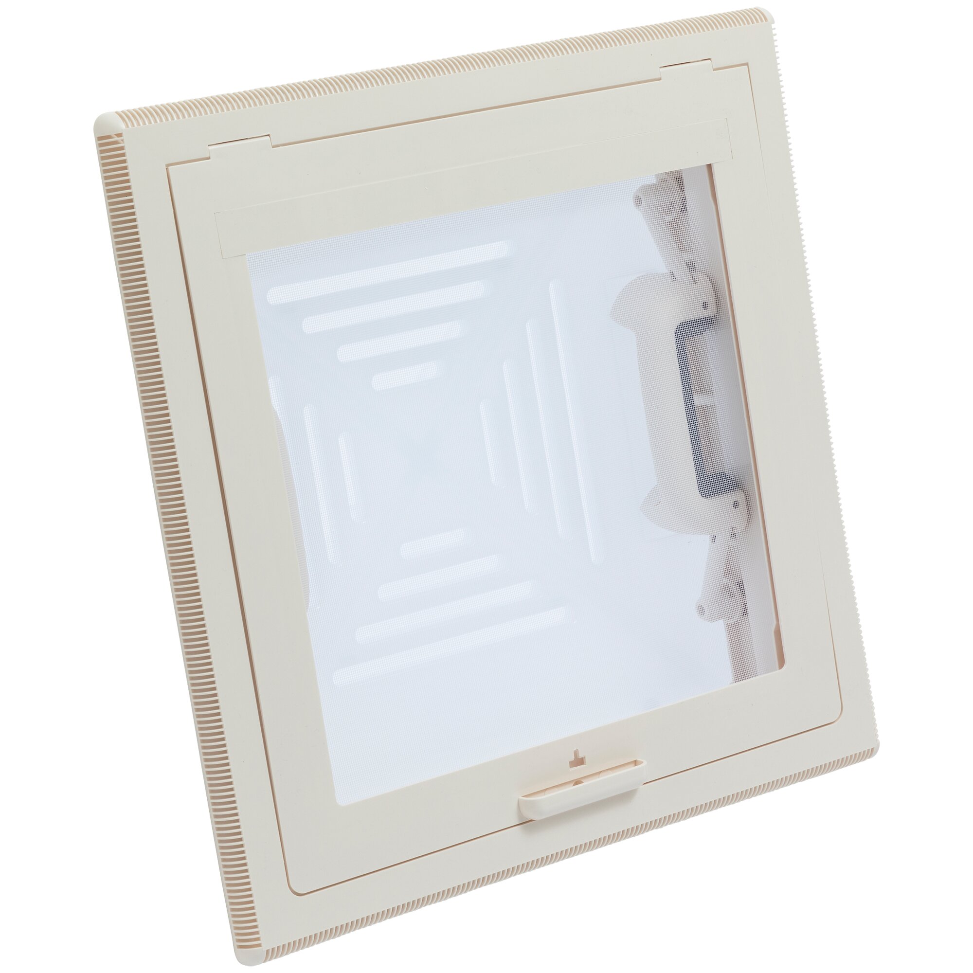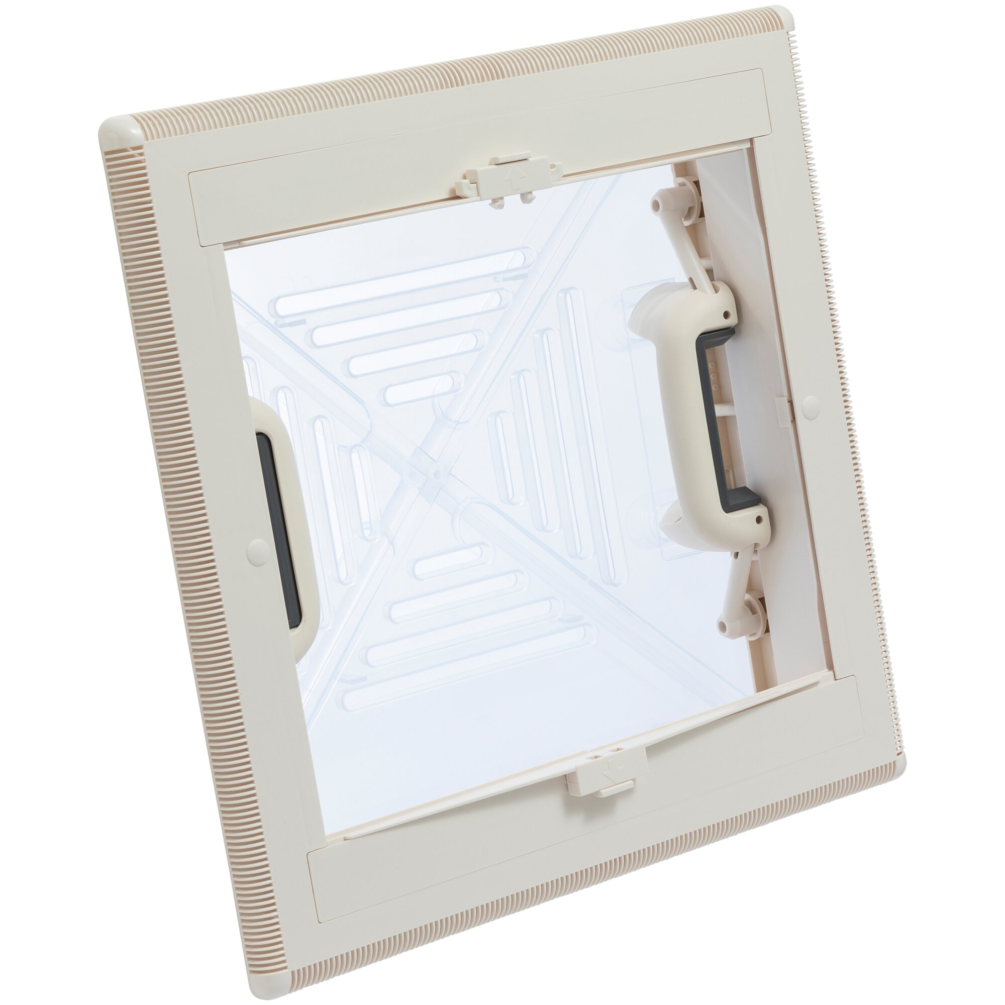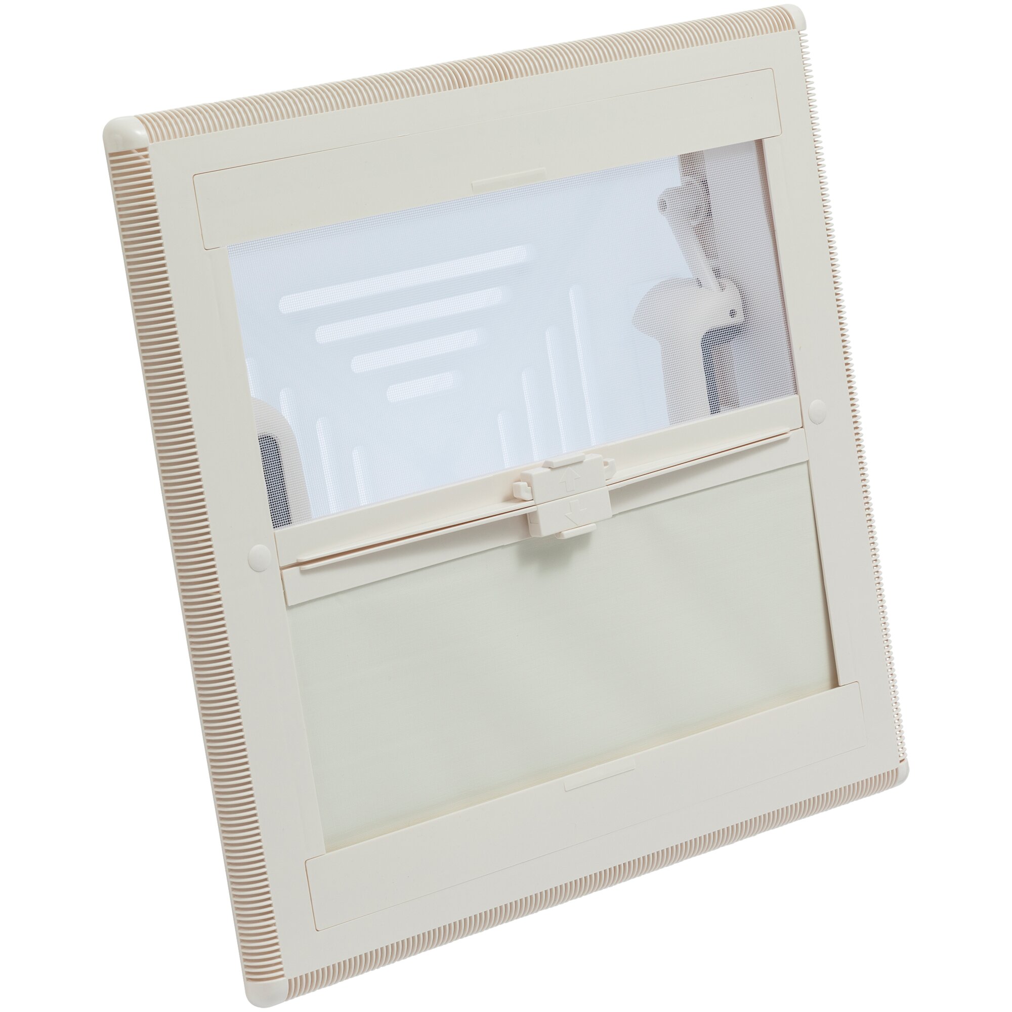 Große Haube aus Polypropylen-Milchglas, Innenrahmen mit integriertem Kombirollo (Fliegengitter und Verdunkelungsrollo), vierseitig aufstellbare Teleskopaussteller mit Verriegelung, abklappbarer Insektenschutzrahmen. Inklusive Fliegengitter und Verdunkelung – für erholsames Reisen mit Durchblick und Schutz.