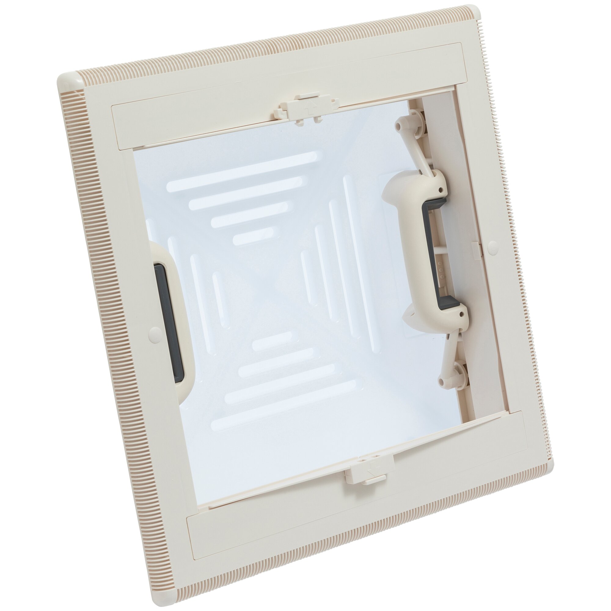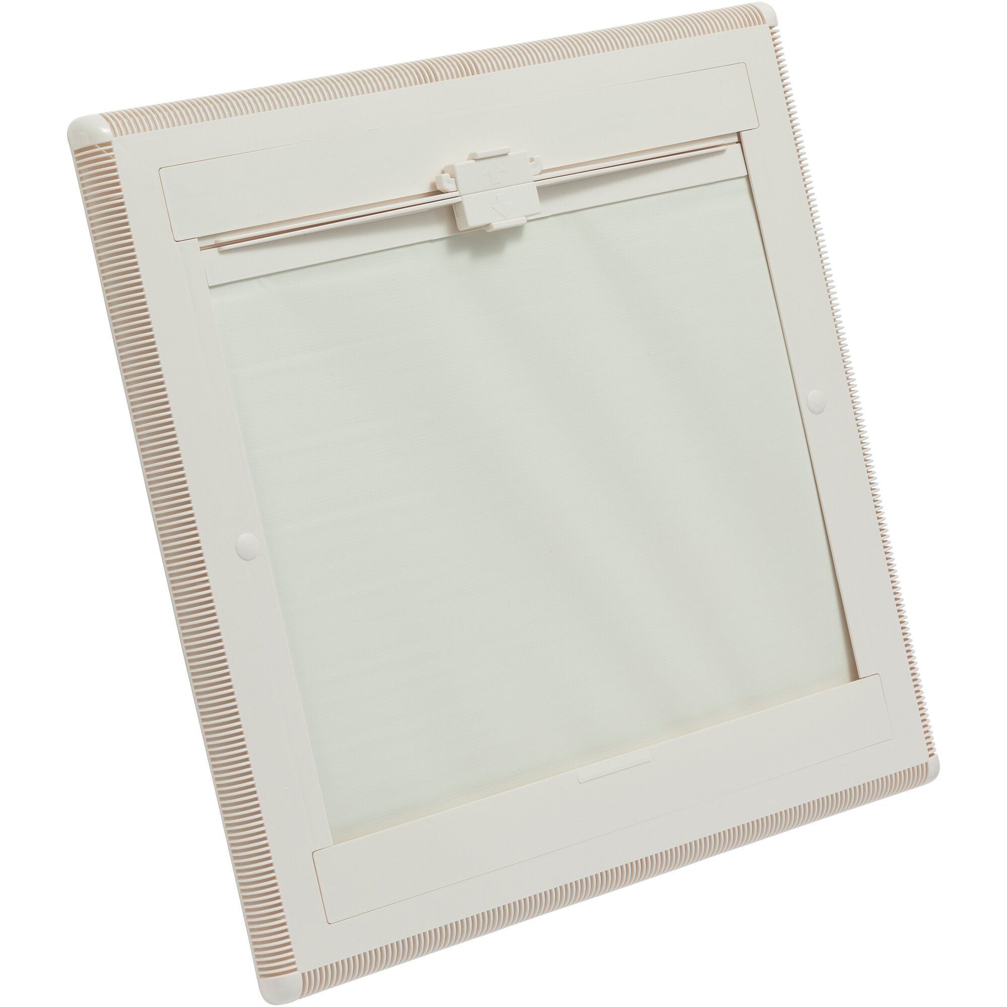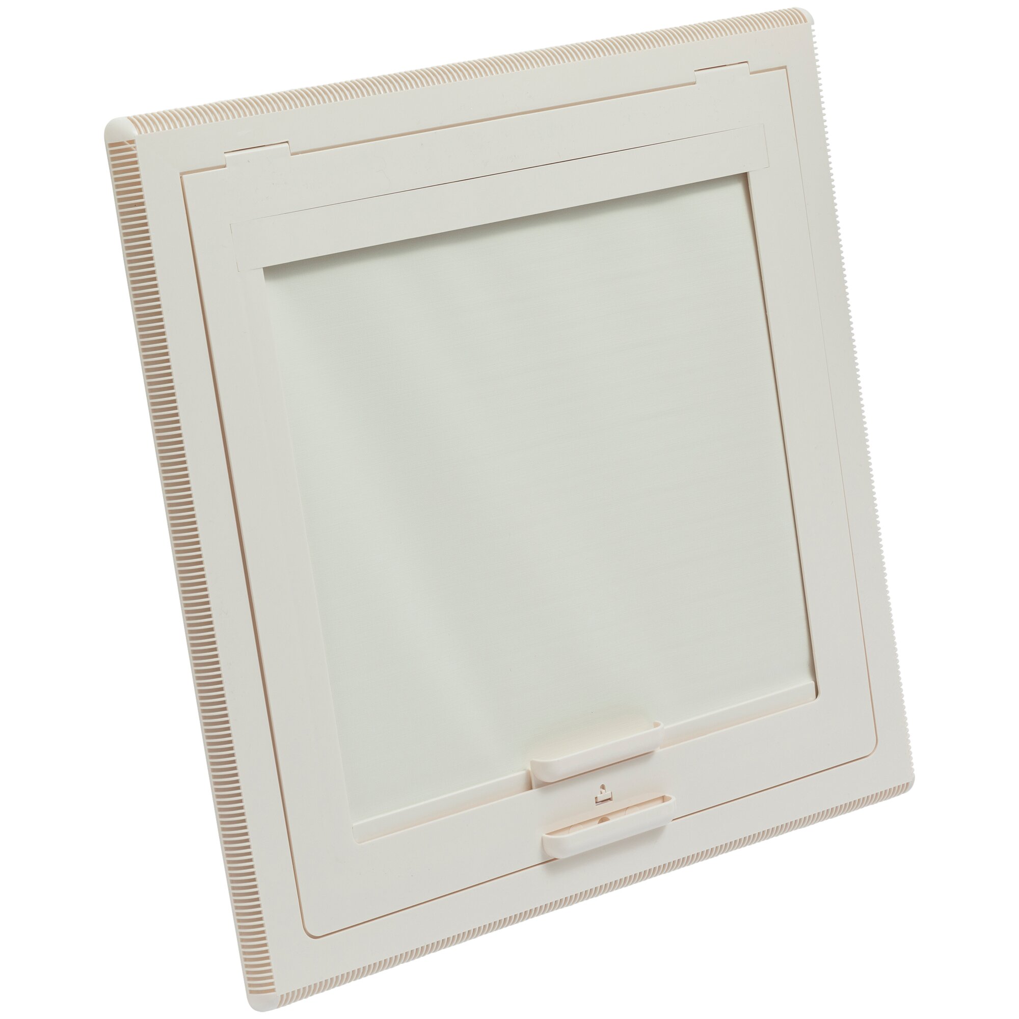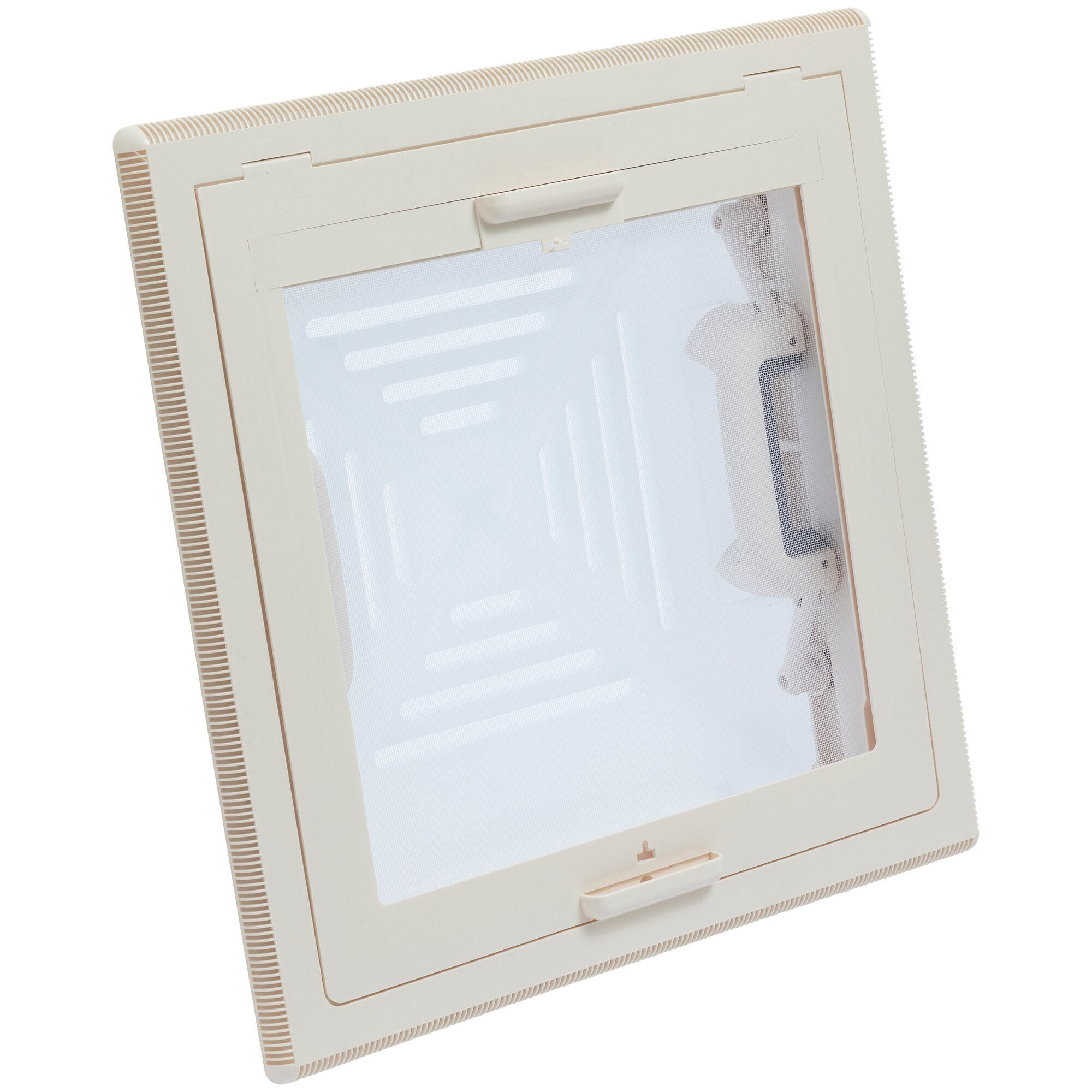 Große Haube aus Polypropylen-Milchglas, Innenrahmen mit integriertem Kombirollo (Fliegengitter und Verdunkelungsrollo), vierseitig aufstellbare Teleskopaussteller mit Verriegelung, abklappbarer Insektenschutzrahmen. Inklusive Fliegengitter und Verdunkelung – für erholsames Reisen mit Durchblick und Schutz.