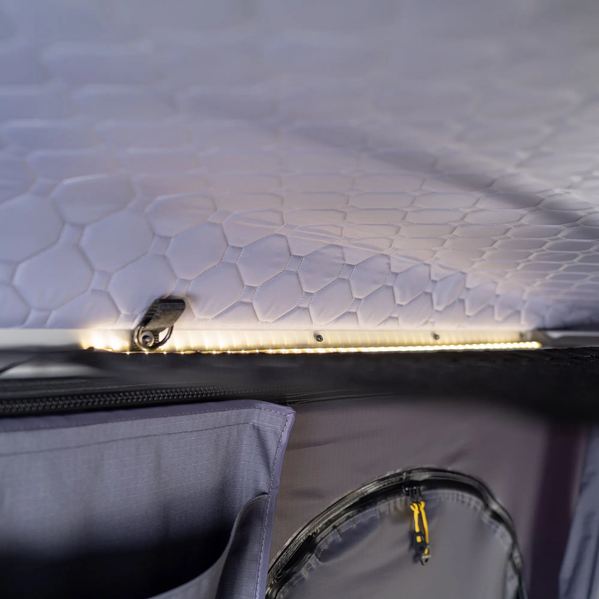 Für eine angenehme Nachtruhe sorgt die 7 cm starke Memory-Foam-Matratze mit weichem Flanellbezug. Die darunterliegende 3D-Mesh-Unterlage schützt wirksam vor Feuchtigkeitsstau, da sie für eine optimale Belüftung und Verdunstung sorgt – ideal zur Vorbeugung von Schimmelbildung. Innen erwartet Sie neben Komfort auch eine durchdachte Raumorganisation: LED-Streifen sorgen für angenehme Beleuchtung bei Dunkelheit, ein großes Staunetz unter dem Dach bietet Platz für Decken und Kleidung, und eine flexibel platzierbare Organizer-Tasche sowie eine praktische Außentasche für Schuhe halten den Innenraum sauber und aufgeräumt.
