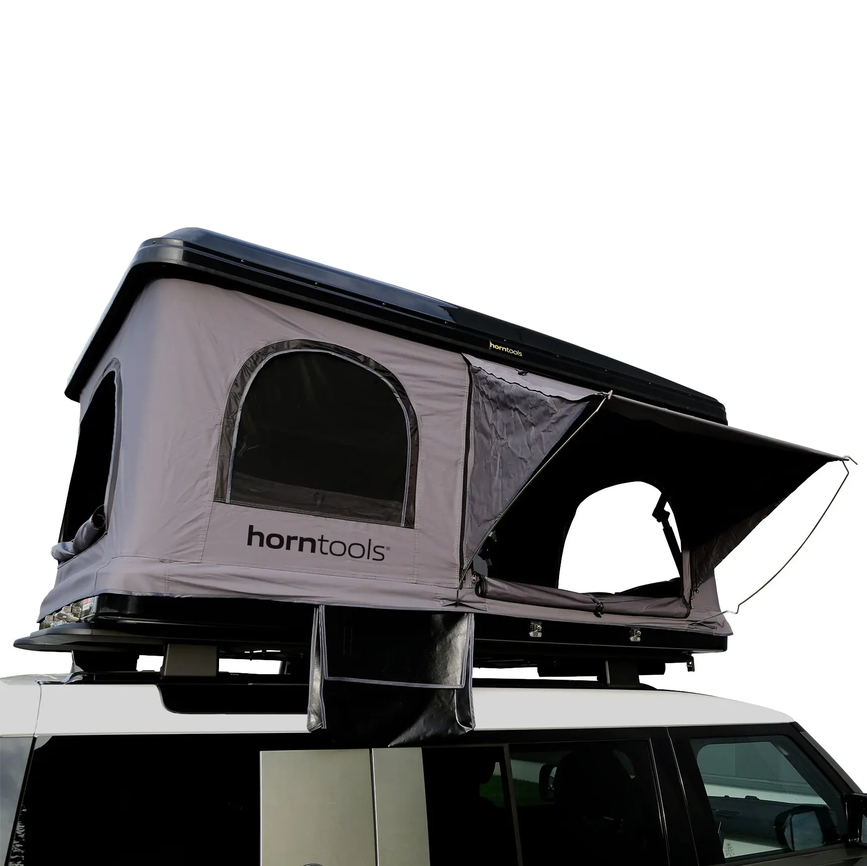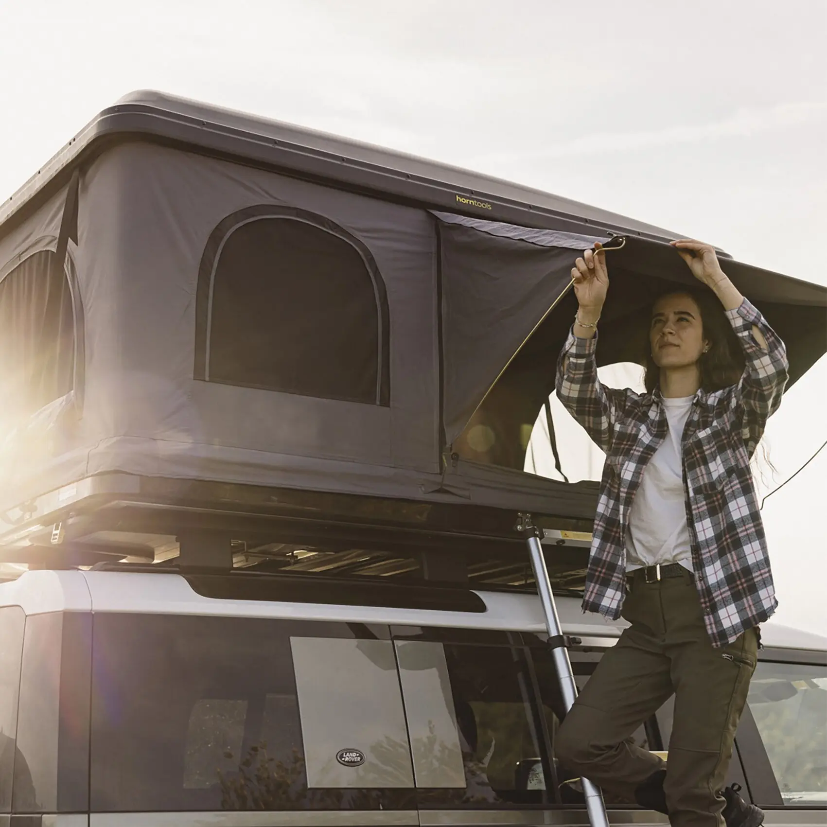 Das Hartschalen-Dachzelt Themis überzeugt mit einer durchdachten Kombination aus Komfort, Funktionalität und robuster Bauweise. Der Aufbau ist in weniger als drei Minuten abgeschlossen – ganz unkompliziert und auch alleine möglich. Einfach die Verschlüsse lösen, das Zelt hebt sich selbstständig und ist sofort einsatzbereit. Mit drei seitlichen Eingängen passt sich das Zelt flexibel jeder Umgebung an. Je nach Standort und Windrichtung lässt sich die Teleskopleiter genau dort einhängen, wo sie benötigt wird.