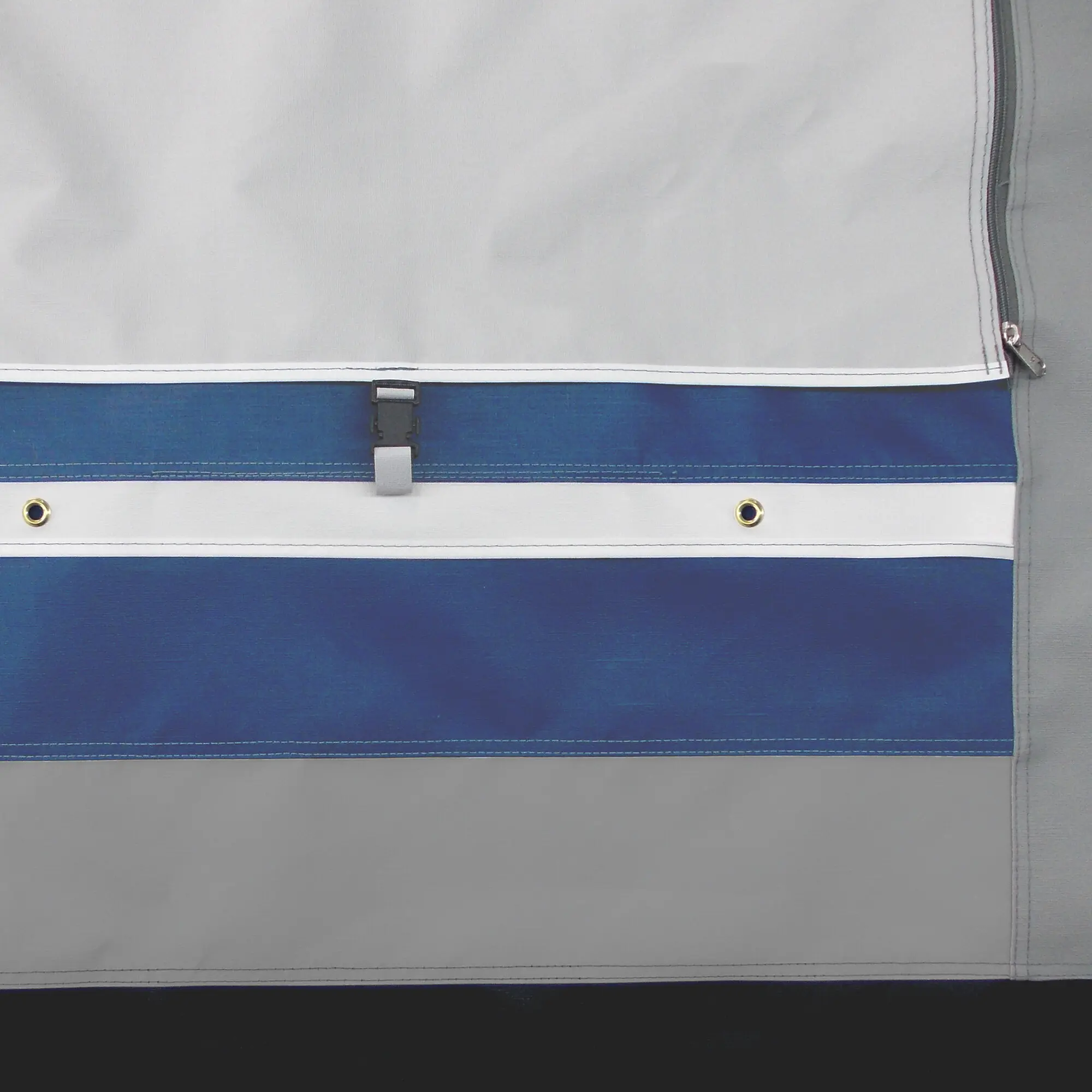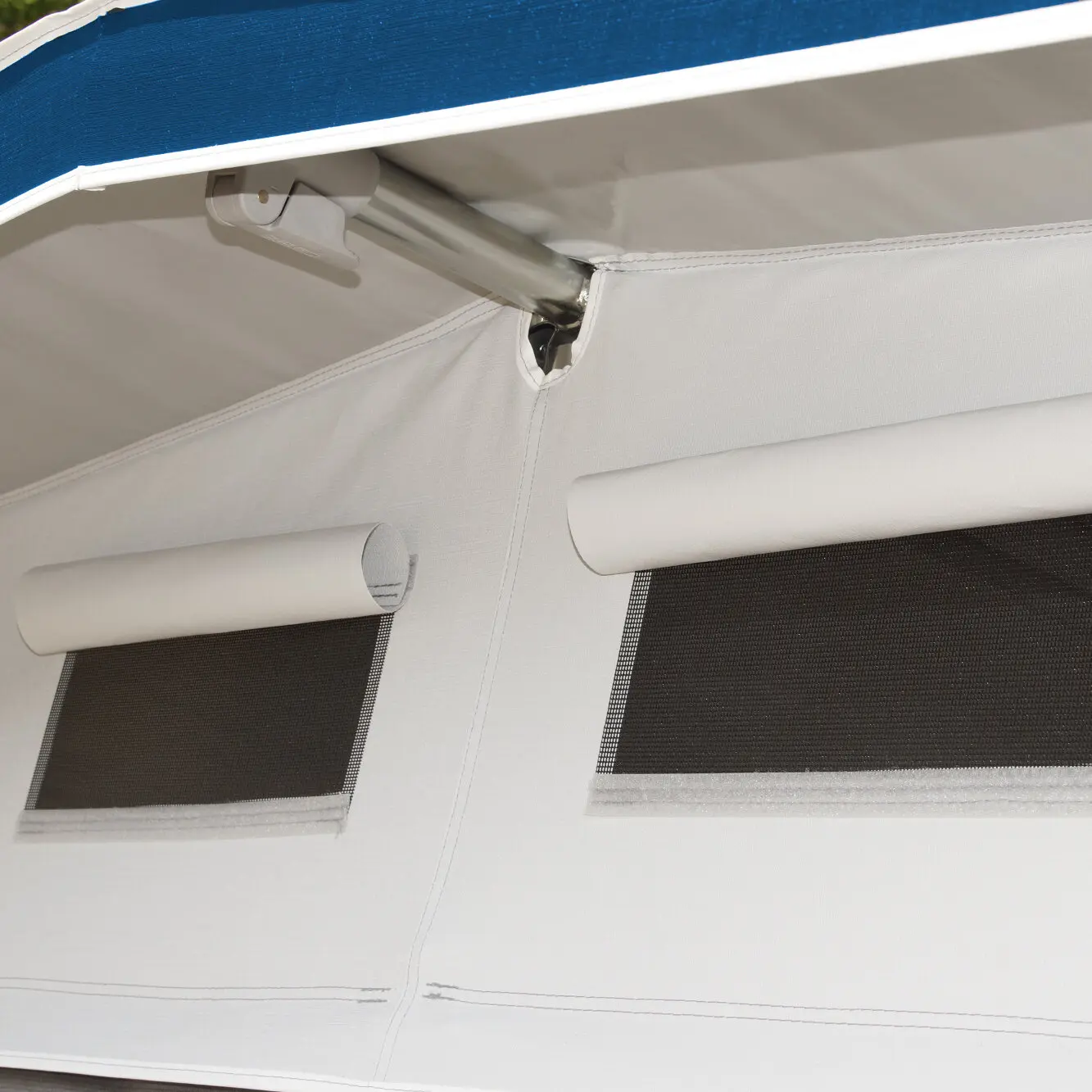 Vorderwand: aus 4 Teilen bestehend, herausnehmbar und zur Veranda abrollbar. Tür hochrollbar. Mit Sturmlaschen innen, Sturmabspannleiste außen und abgedeckten Reißverschlüssen. Außenklappen aus Planenstoff.