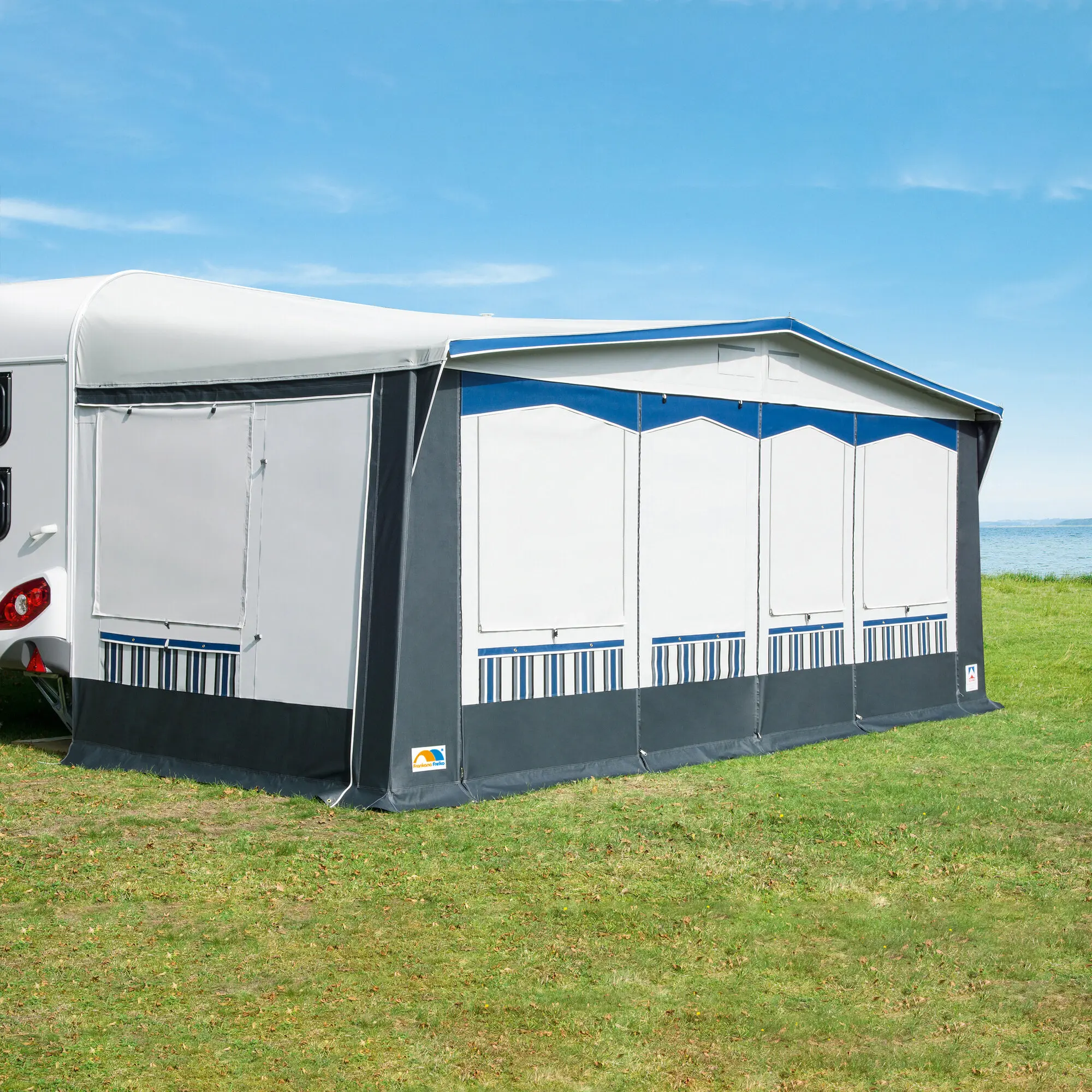 Unser Voll-PVC-Vorzelt für den anspruchsvollen Dauer- oder Saisoncamper oder den qualitäts- und komfortbewussten Camper. Ringsum Fensterklappen aus Planenstoff. Schwere und abgedeckte Reißverschlüsse. Doppelte Gardinenleiste und Gardinen mit Rollenaufhängung sowie doppelter Erdstreifen. Hohlsaumtaschen im Vordach. Klettbandkanäle für Sturmfestigkeit. Passend auch für Fahrzeuge mit aerodynamischer Bugform (KNAUS, Bürstner, Eifelland usw.).