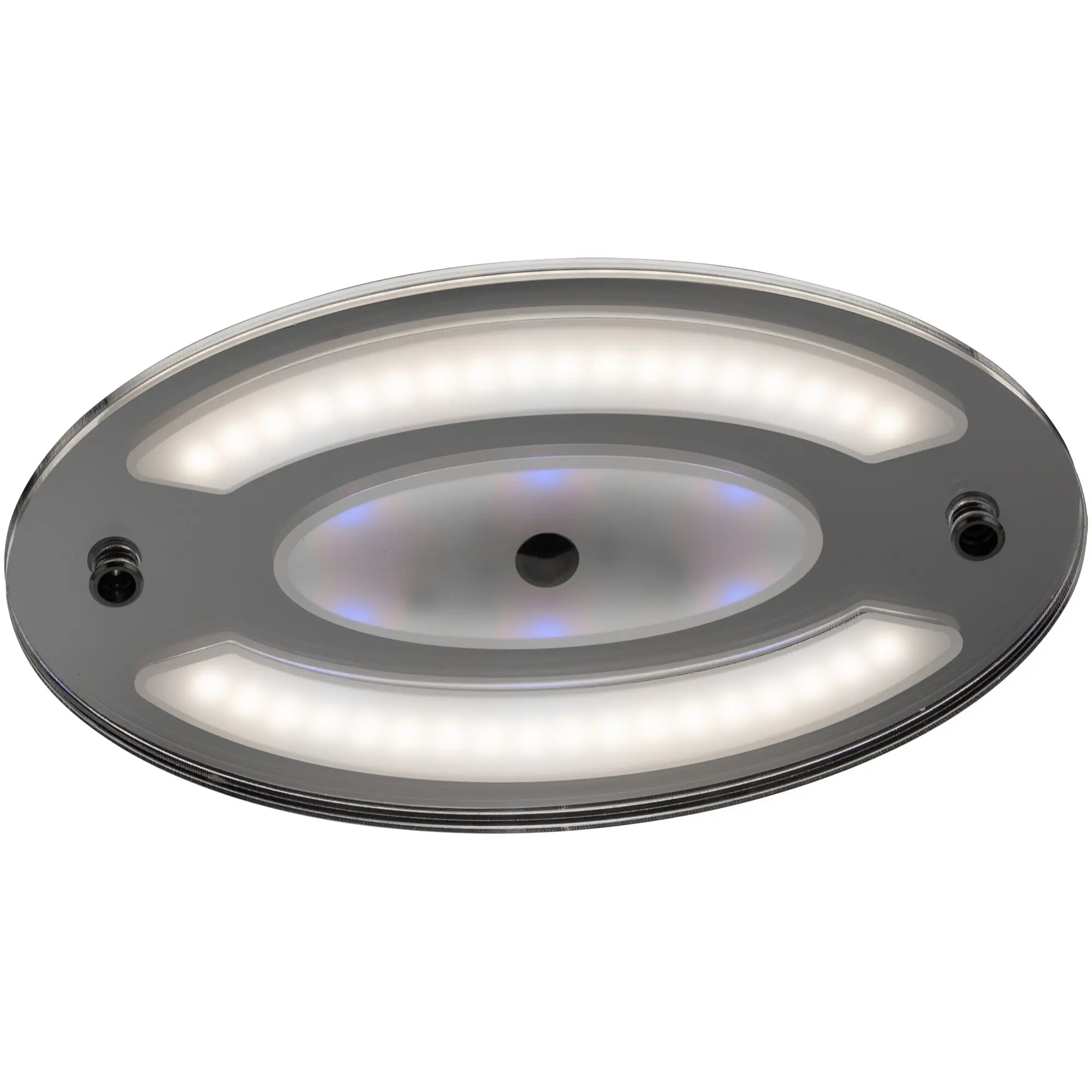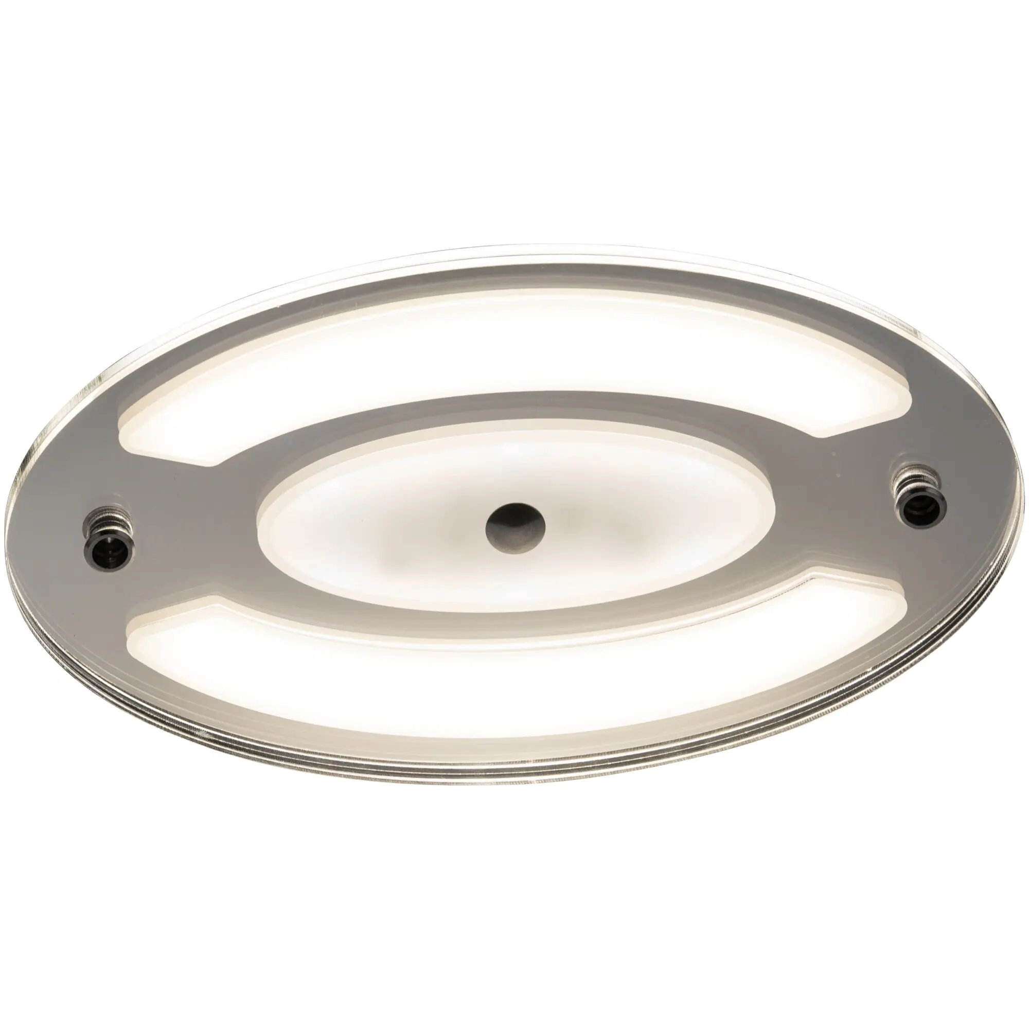 Die LED-Deckenleuchte Oval ist mit 12 SMDs ausgestattet und lässt sich per Touchfunktion ein- und ausschalten sowie stufenlos dimmen. In der zweiten Schaltstufe bietet die Lampe ein dezentes, blaues Nachtlicht. Farbtemperatur: 4000 K; Material: Acryl-/Spiegelglas.