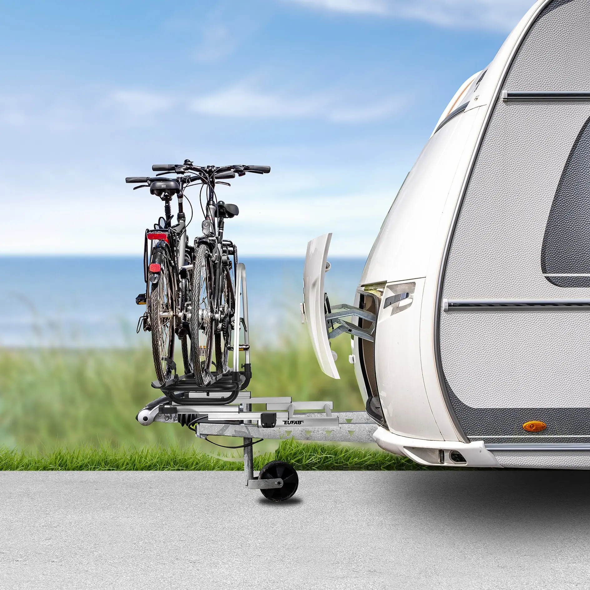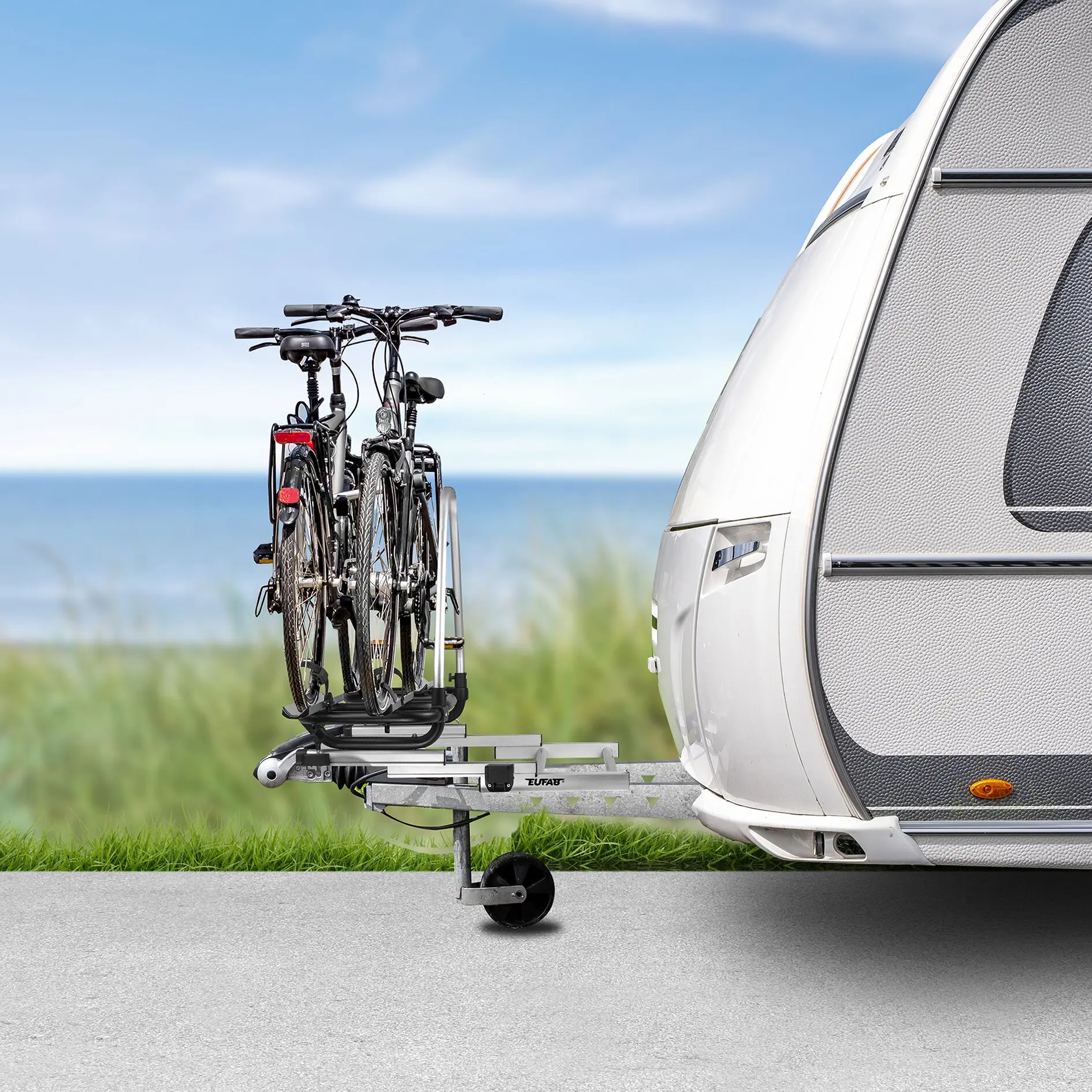 Der EUFAB BS260 ist ein leichter, extraschmaler Deichselträger für zwei Fahrräder und ermöglicht dank eines ausziehbaren Schiebesystems den einfachen Zugang zum Staukasten. Er ist kompatibel mit nahezu allen Wohnwagendeichseln und wird ohne Bohren mittels Befestigungsklammern montiert. Die Aluminium-Profilschienen tragen bis zu 30 kg pro Schiene, sind für Radstände bis 135 cm geeignet und fixieren Fahrräder sicher mit abnehmbaren Rahmenhaltern, Spanngurten und Ratschen. Ideal für Reifen bis 2,35 Zoll.