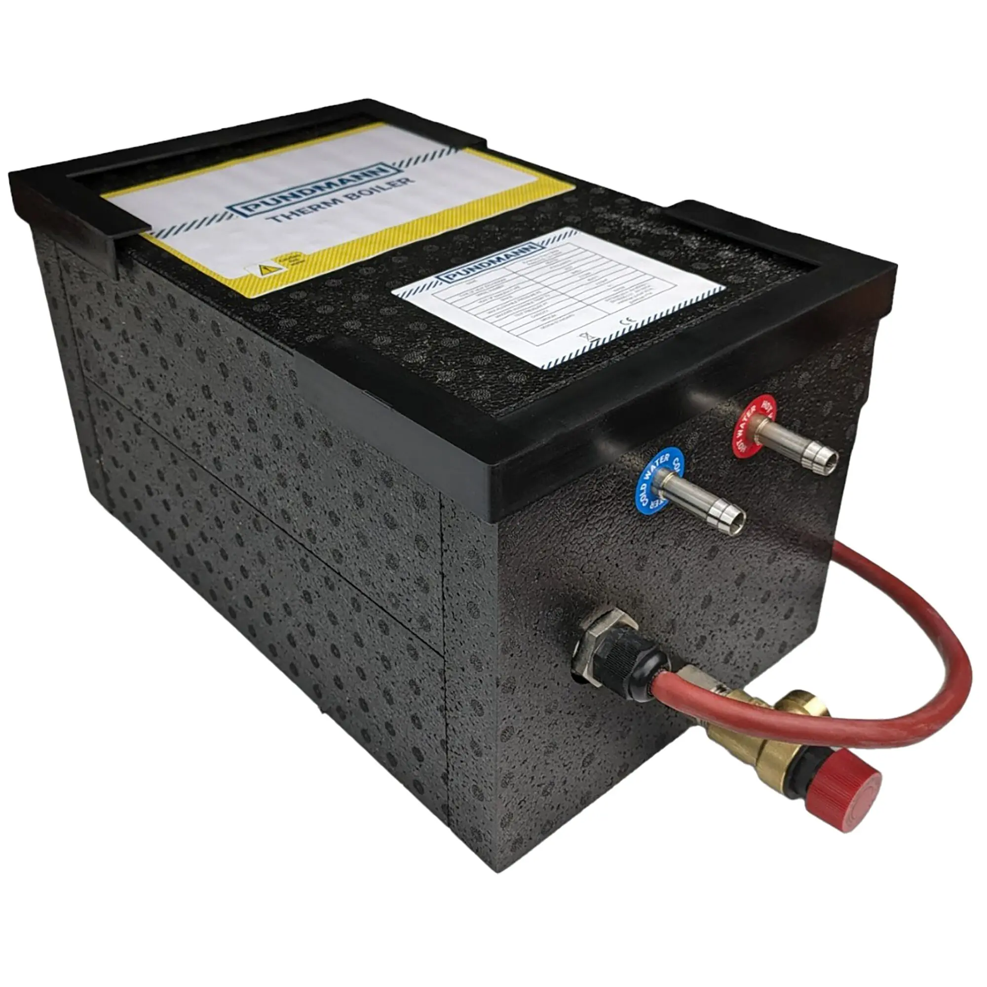 Der Pundmann Druckboiler ist in 3-, 6- oder 9-Liter-Ausführungen erhältlich und erwärmt Wasser mit einem 180-W- oder 200-W-Heizelement über eine 12-V-Stromversorgung. Bei 2,3 bar Betriebsdruck bleibt das Wasser länger warm. Der Boiler startet die Erwärmung automatisch und schaltet sich ab, sobald die gewünschte Temperatur erreicht ist. Seine kompakte Bauweise und einfache Bedienung machen ihn zu einem praktischen und funktionalen Gerät.