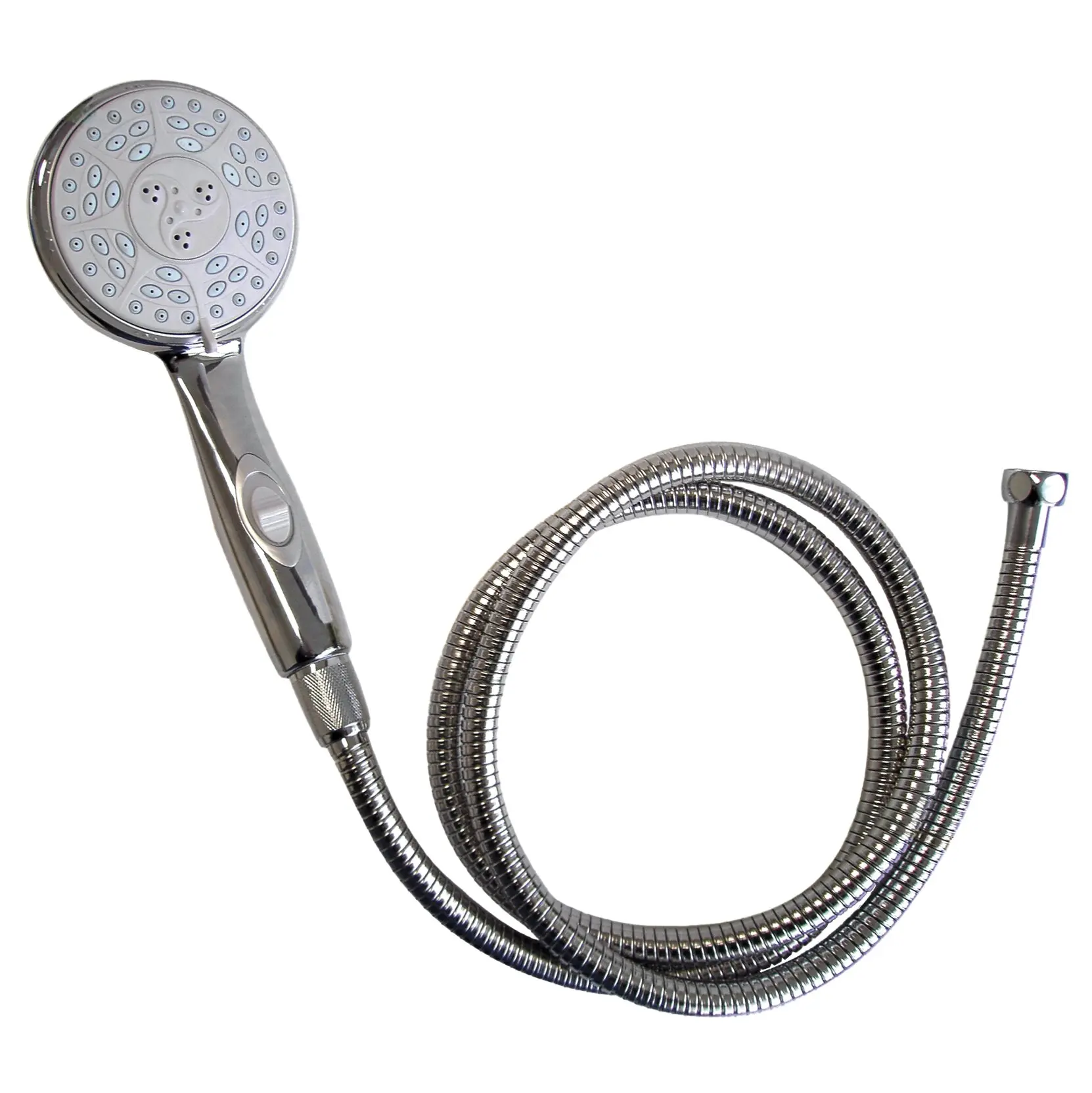 Wasserabstellknopf direkt am Brausekopf, dadurch hohe Wasserersparnis möglich. Mit Massagefunktion, 5-fach verstellbar, leicht zu reinigen. Inkl. 1,5 m langem, verchromtem Schlauch, Wandhalter und Befestigungsmaterial. Beidseitiger Anschluss von 1/2".