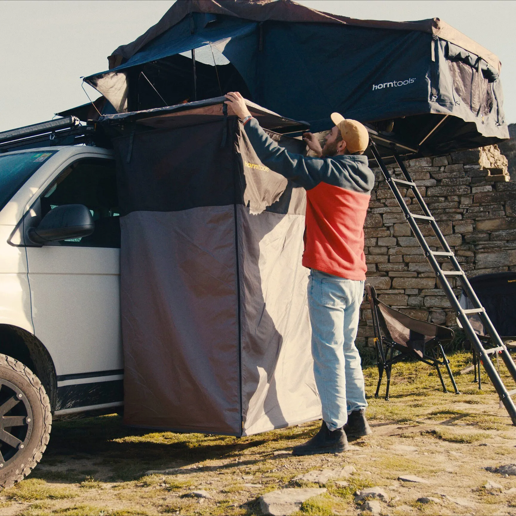 Ideal für Camping, Overlanding und Festivals. Befestigt am Dachträger, schnell einsatzbereit und stabil. Mit LED-Leisten, Taschen, Durchreiche und Vorhang. Inkl. Halterungen und Montagematerial.