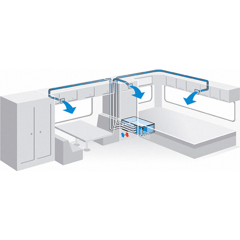 The air flow generated is distributed evenly via 3 outlet openings, and the openings can be positioned individually in the vehicle with the aid of accessories – concentrated in one place or in different rooms. It weighs just 21 kg, has an extremely compact design and is suitable for vehicles up to 8 m in length. It has an energy-efficient heat pump system for cooling and heating. The soft start feature ensures trouble-free start-up even with a weak fuse.