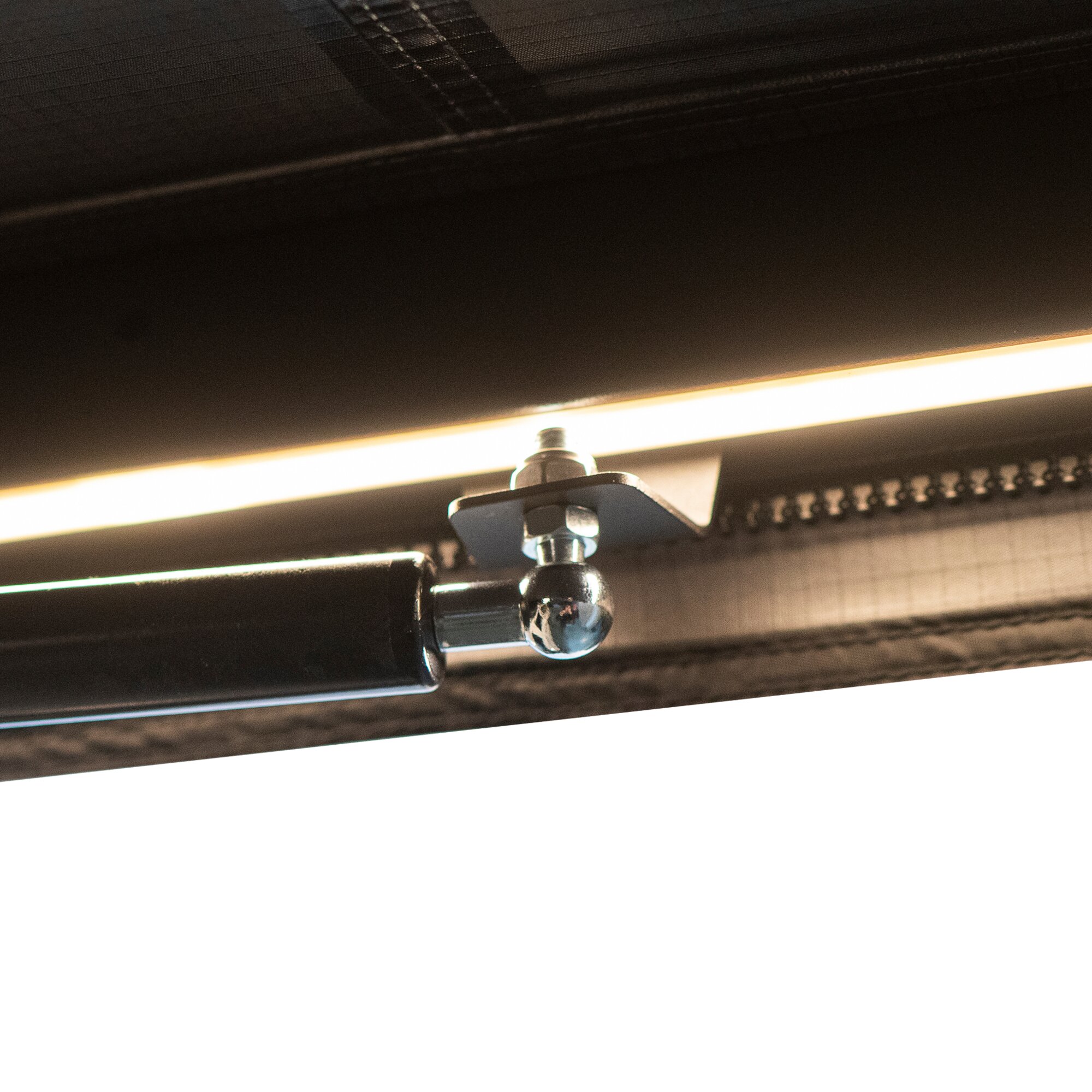 The horntools Horizon Straight awning is self-supporting, lightweight and set up in seconds – ideal for spontaneous stops with a roof tent or carrier system. It provides reliable weather protection with UPF 50+ and a hydrostatic head of 3000 mm. A dimmable LED provides light in the evening. Incl. accessories for immediate installation; side walls are available as an option. Compatible with many roof rack systems, particularly easy with the ExRoof bracket.