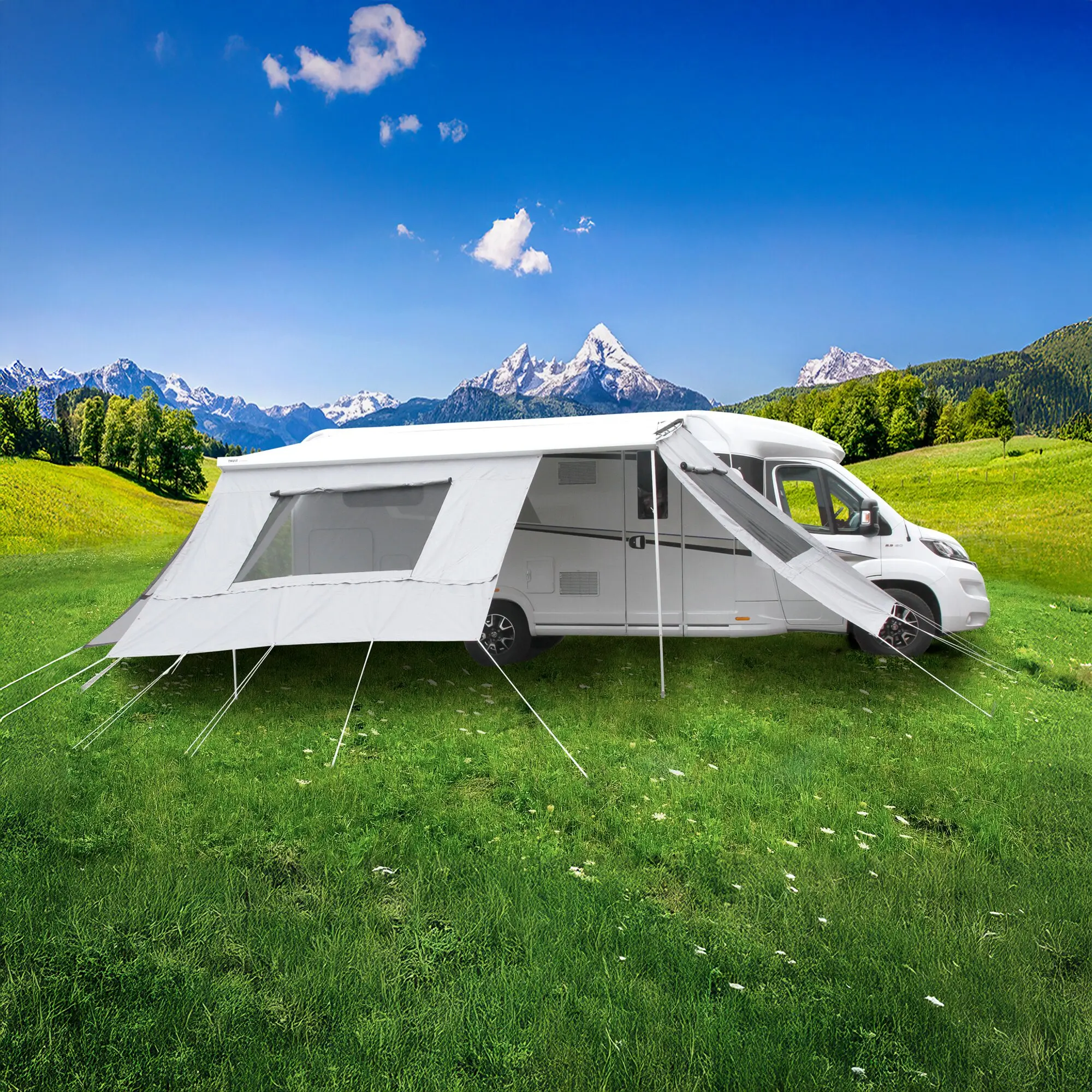 The Camper Lounge quickly creates more space, protection and privacy. It is quickly set up and taken down without tools – ideal for spontaneous stops. The system includes two side walls and a front wall that slides into the awning rail via the piping. The side walls can be flexibly attached to a Rafter pole or an articulated arm. Guy ropes, pegs and flutter stoppers are included. The Camper Lounge reliably protects you from sun, wind and light rain. Closable panorama windows ensure ventilation and a view. Suitable for awnings with an extension of 2.5 m and a width of 3 m – ideal for motorhomes.