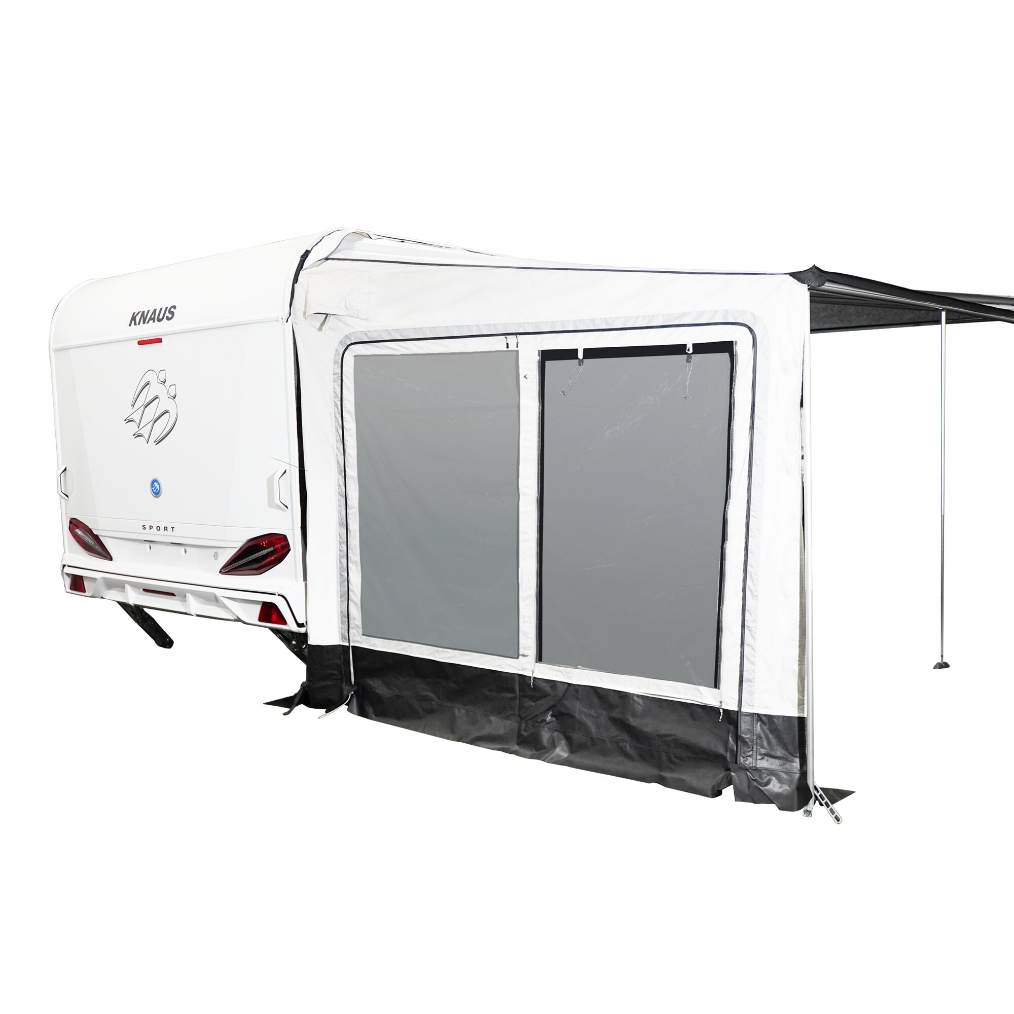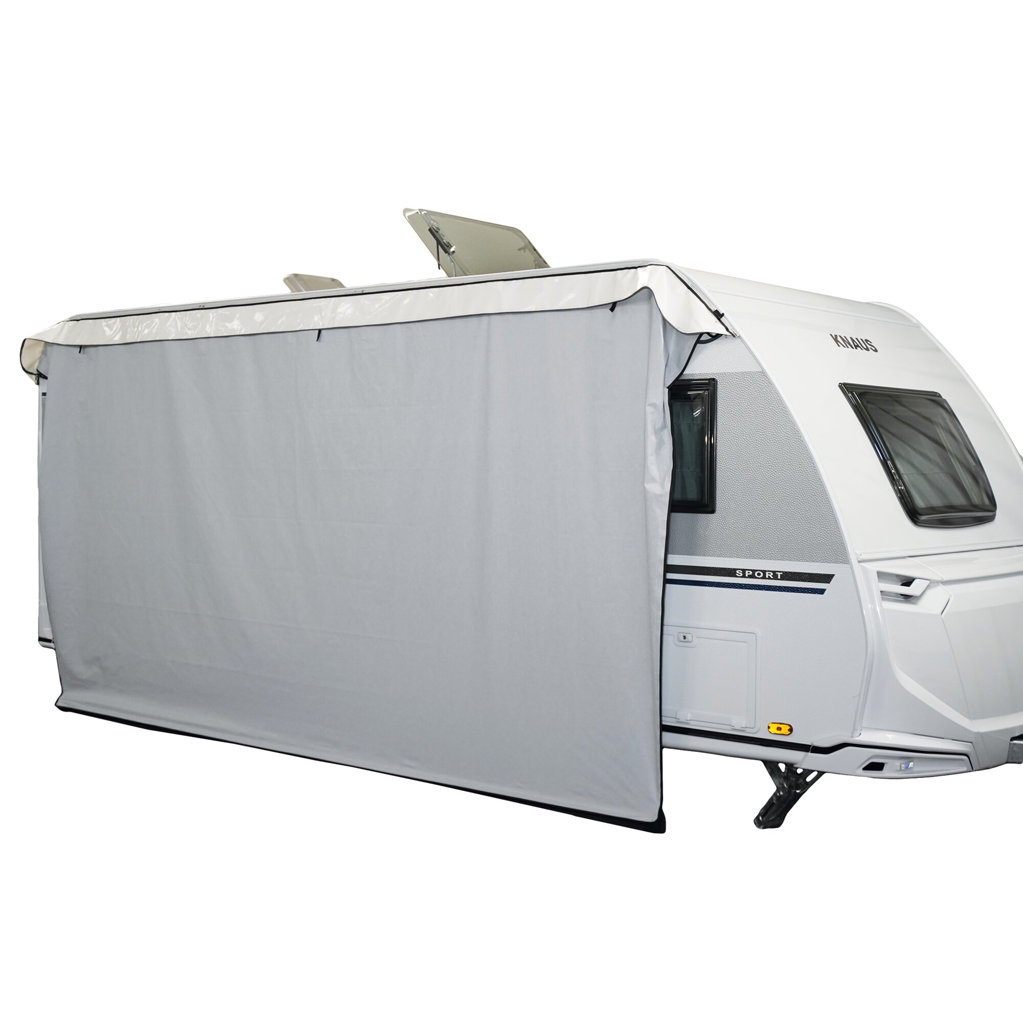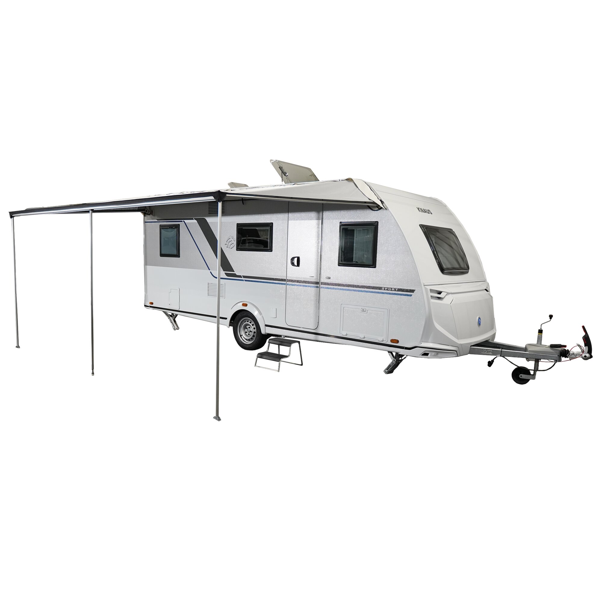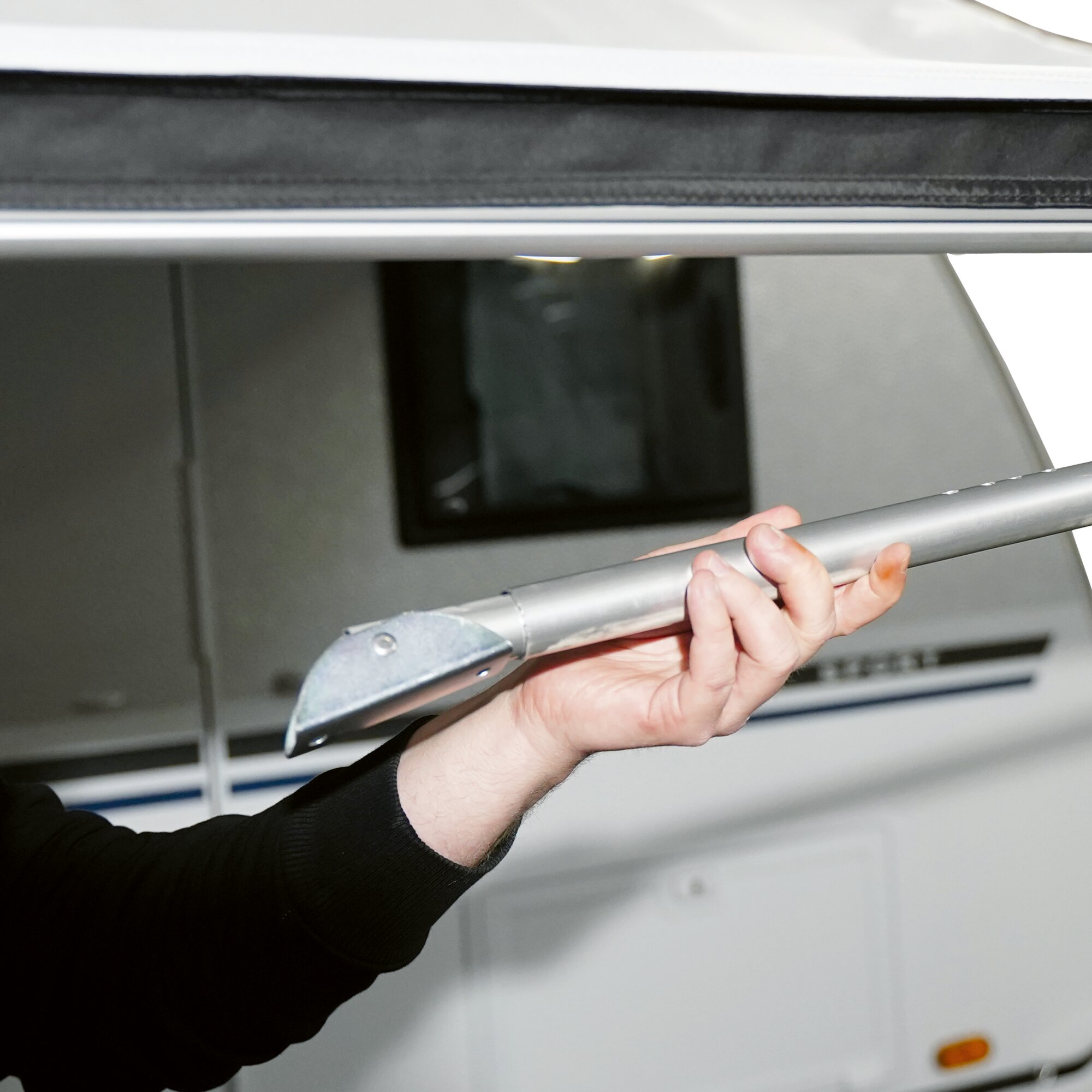 Luna Plus is a bag awning that can be easily extended to a full-out awning with the included accessories. Once inserted into the piping rail, the awning remains attached to the vehicle. On-site, it is rolled out, the support poles and rafters are unfolded – and you can enjoy a robust shaded area. The side and front walls can be flexibly attached using Velcro.