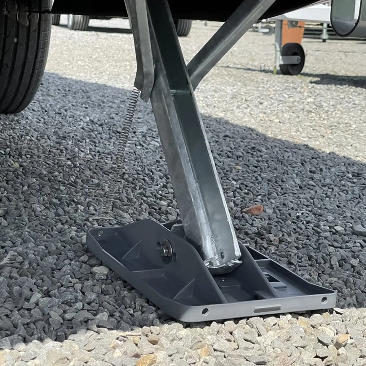 The Multianker base enlarges the contact surface of the caravan supports. It prevents the supports from sinking in or slipping away on soft ground and ensures that the caravan stands absolutely securely.