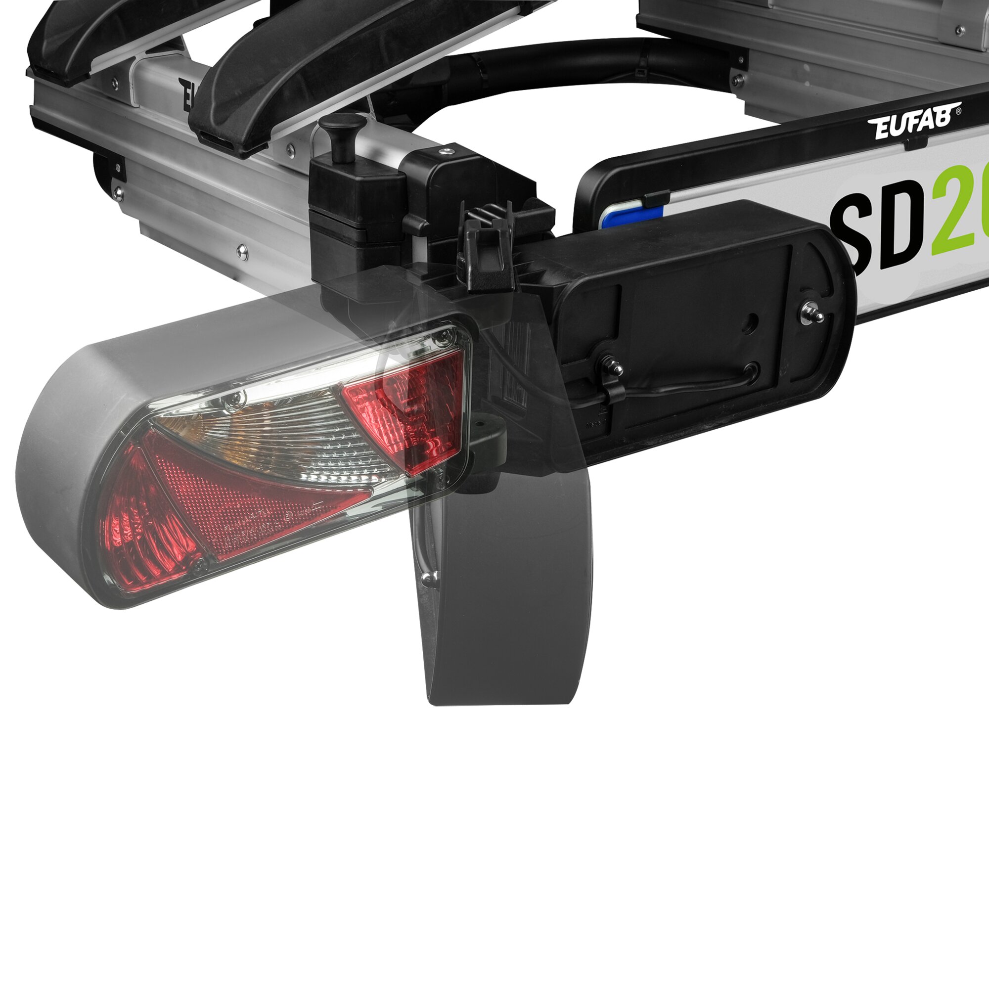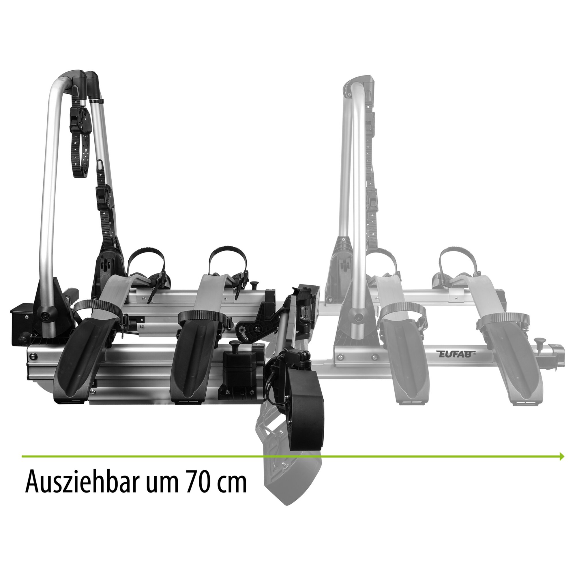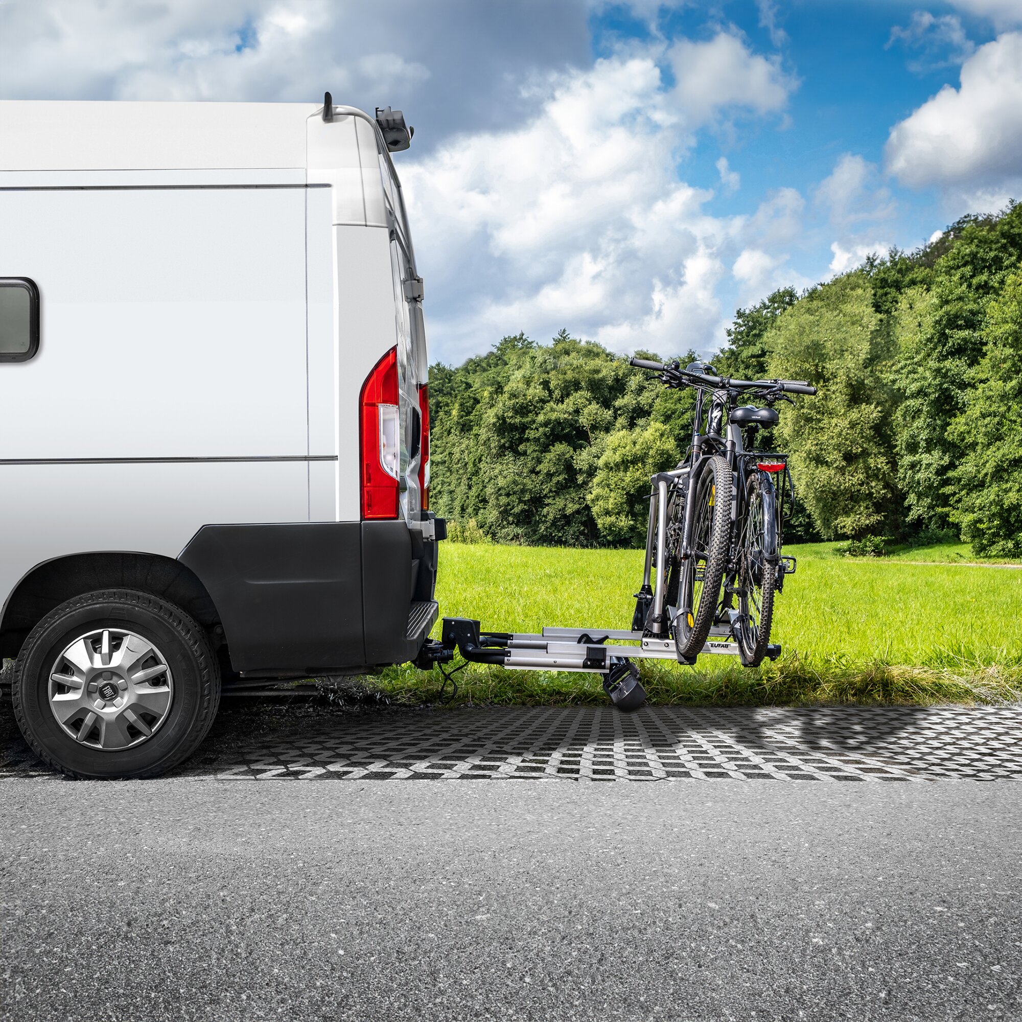 Suitable for transporting bikes on the tow bar of vans, caravans, high-roof estate cars with double rear doors and cars. The slide rails (extension: approx. 70 cm) allow you to open doors with a width of up to 85 cm.