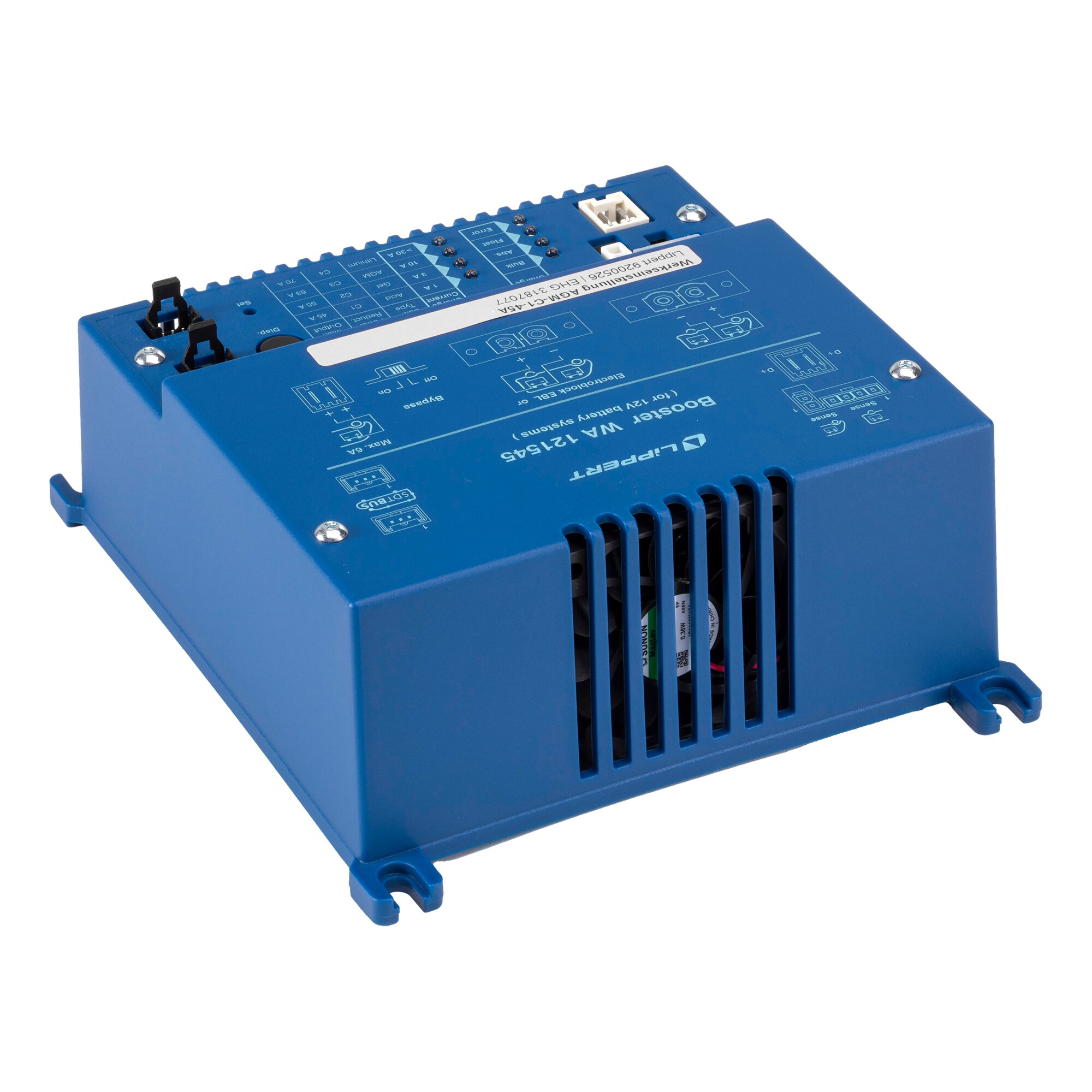 The Booster WA 121545 is a clocked step-up/step-down converter with a very high level of efficiency. It balances the volatile alternator voltage and provides a high charging current. The booster is perfect for charging lead-acid, lead-gel, AGM1, AGM2 and lithium batteries while driving with 12 V mains power. If a battery temperature sensor is connected, the charging voltages are adapted to the battery’s temperature. To guarantee optimal charging, both the voltage of the living area battery and the voltage of the starter battery are measured with a voltage sensor. Scope of delivery: all accessories except the connection cables.