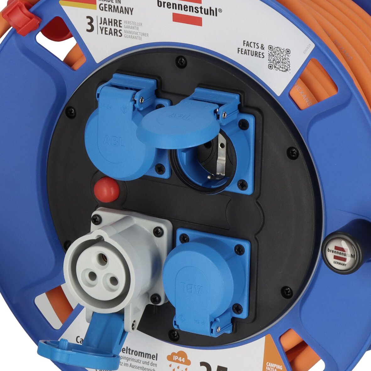 The Garant CEE IP44 cable reel with a length of 25 m is perfect for outdoor use. The robust, oil-resistant RN cable is cold-resistant down to -25 °C. Equipped with a Cable Pilot carrying handle, it offers hands-free transport and efficient winding. With 1 CEE socket and 3 safety sockets.