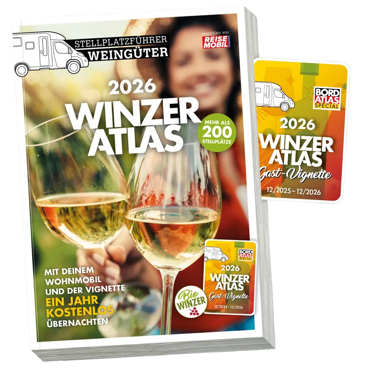 Stay overnight free of charge for one year. With the book and the enclosed vehicle vignette, motorhome drivers may park for free for 24 hours at over 200 wineries – in Germany, Austria, South Tyrol, Hungary and Alsace. Valid from December 2025 to December 2026. Language: German.