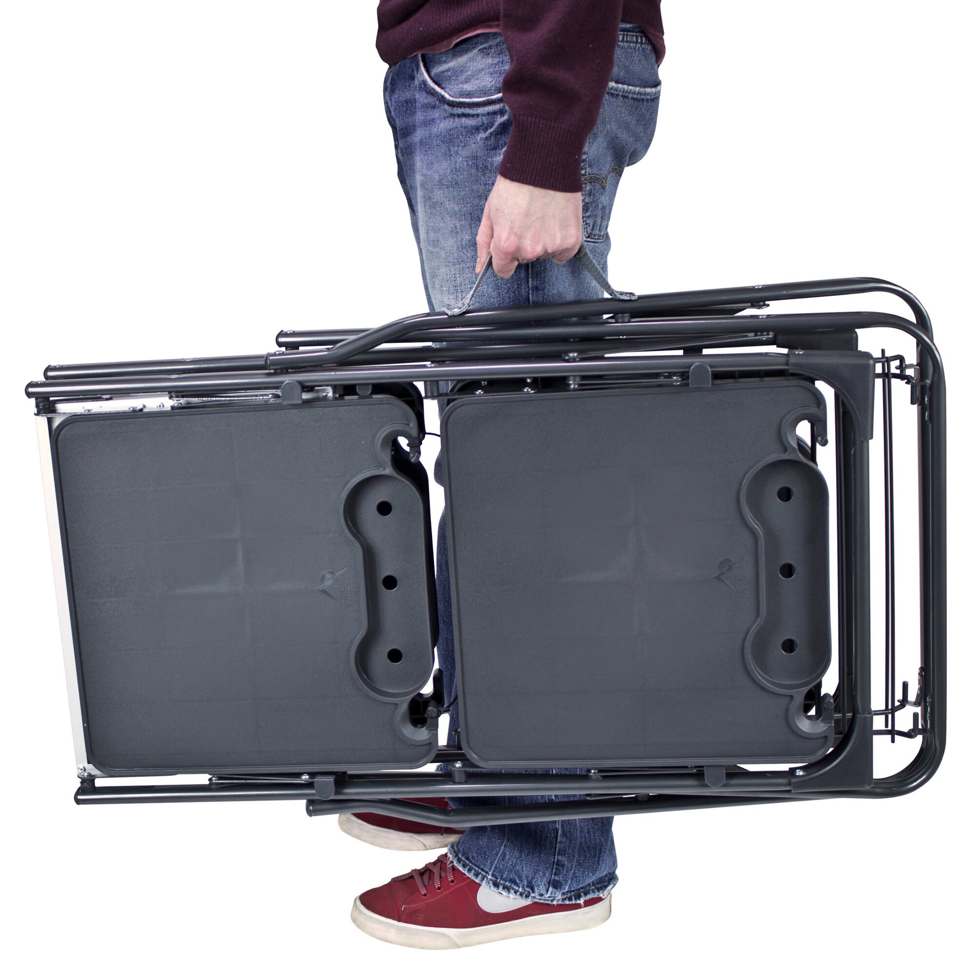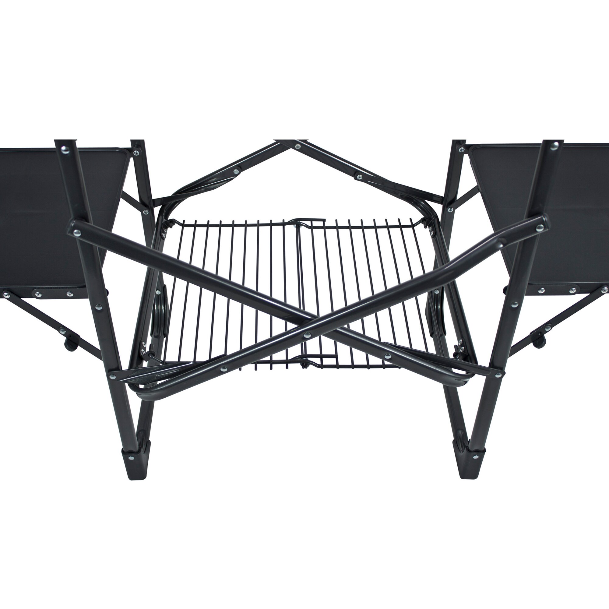 Compact and convenient. The outdoor kitchen can be opened and closed effortlessly. With a heat-resistant aluminium worktop, a lower frame and four fold-out plastic side tables, it offers plenty of space for cooking utensils, drinks and more. Made of robust powder-coated steel and easy to transport.