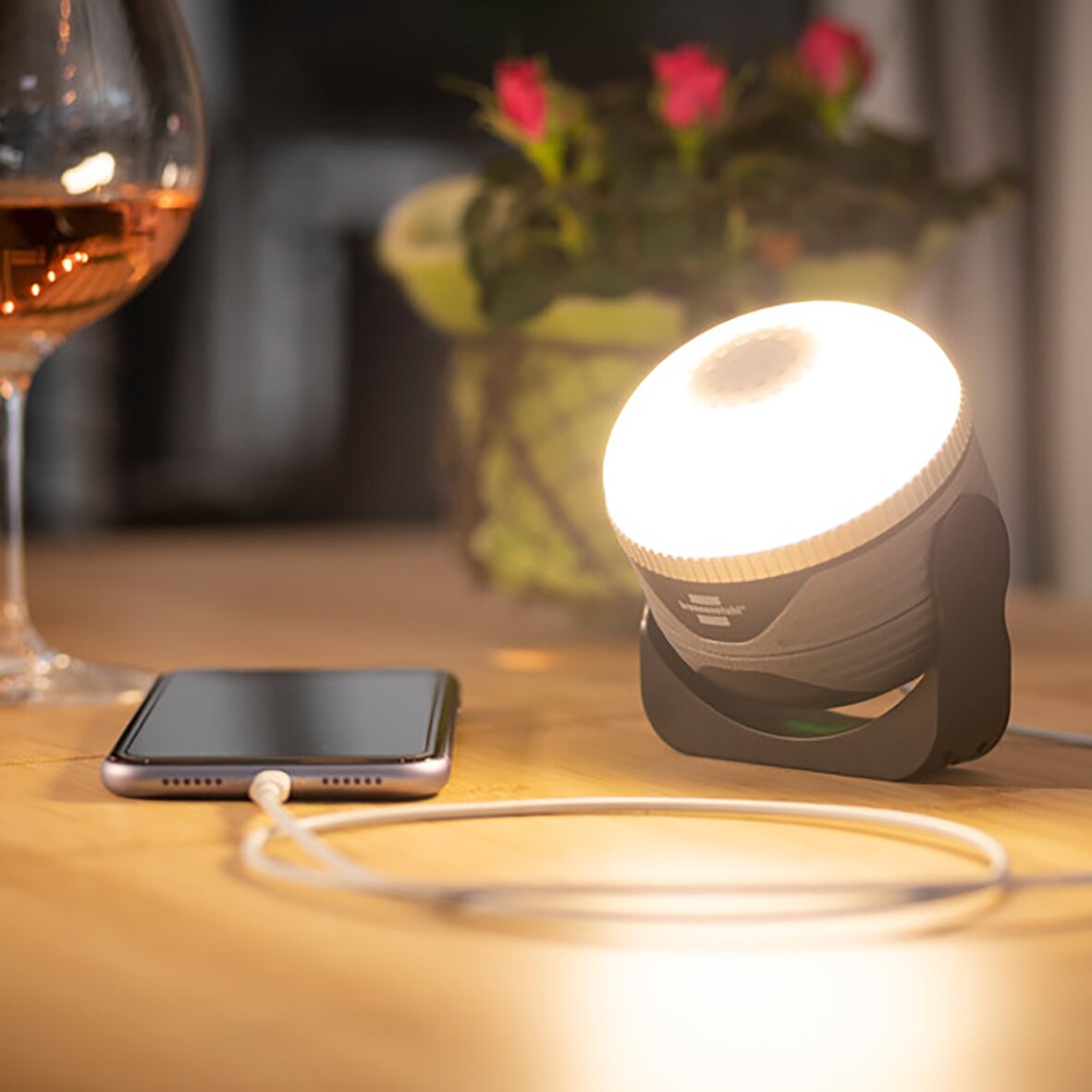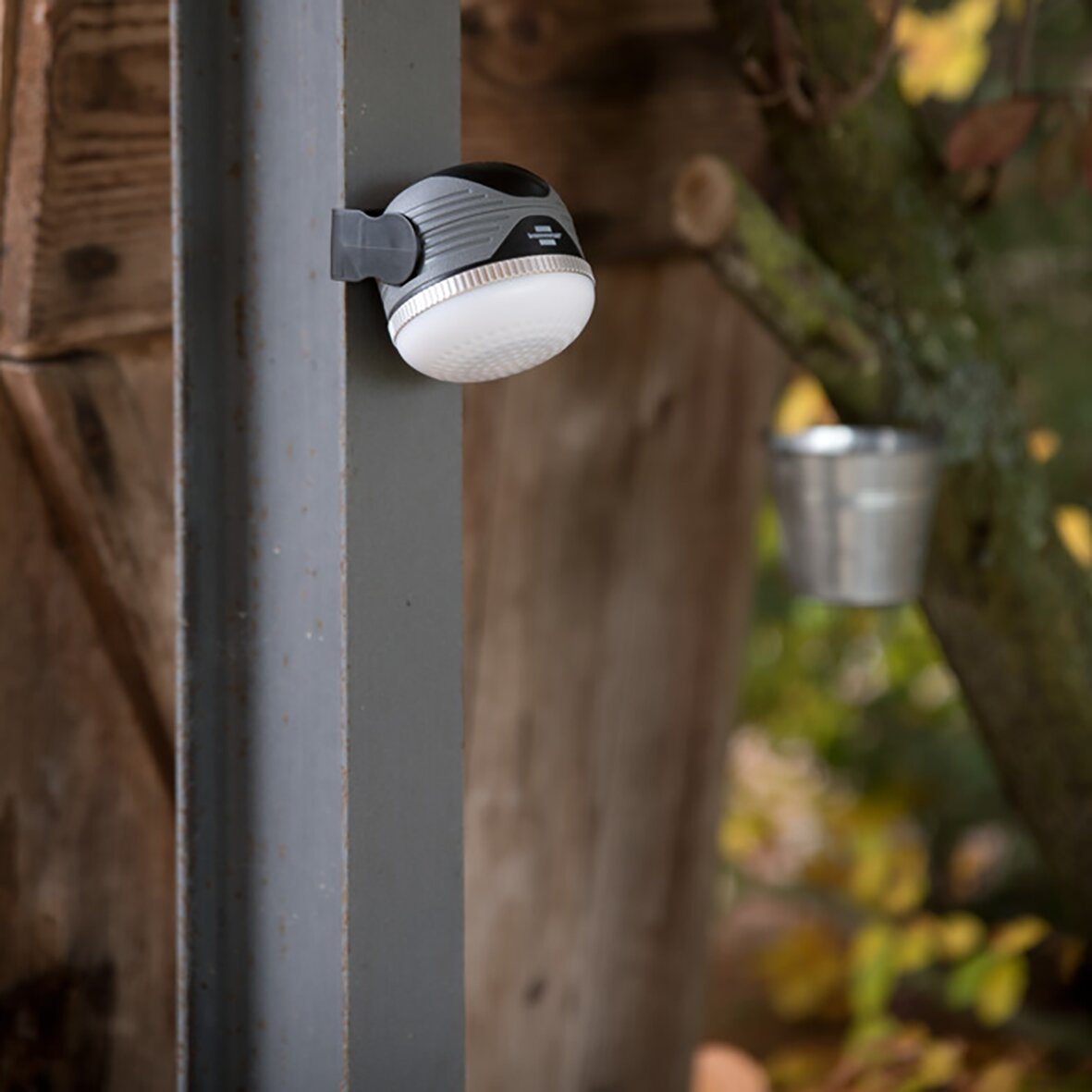 The battery-powered LED outdoor light OLI with integrated Bluetooth speaker is particularly versatile. With switch for various functions: 100% – 40% – 10% – red – red flashing. It can also be used as a warning light, e.g. if your car breaks down. The light is protected against foreign bodies and splash water (IP44). Lighting duration: max. 54 hours. Colour temperature: 4000 K. Integrated lithium ion battery 3.7 V/2 Ah. Power bank: USB charging port (1 A). Charging time: 6 h. IP44.