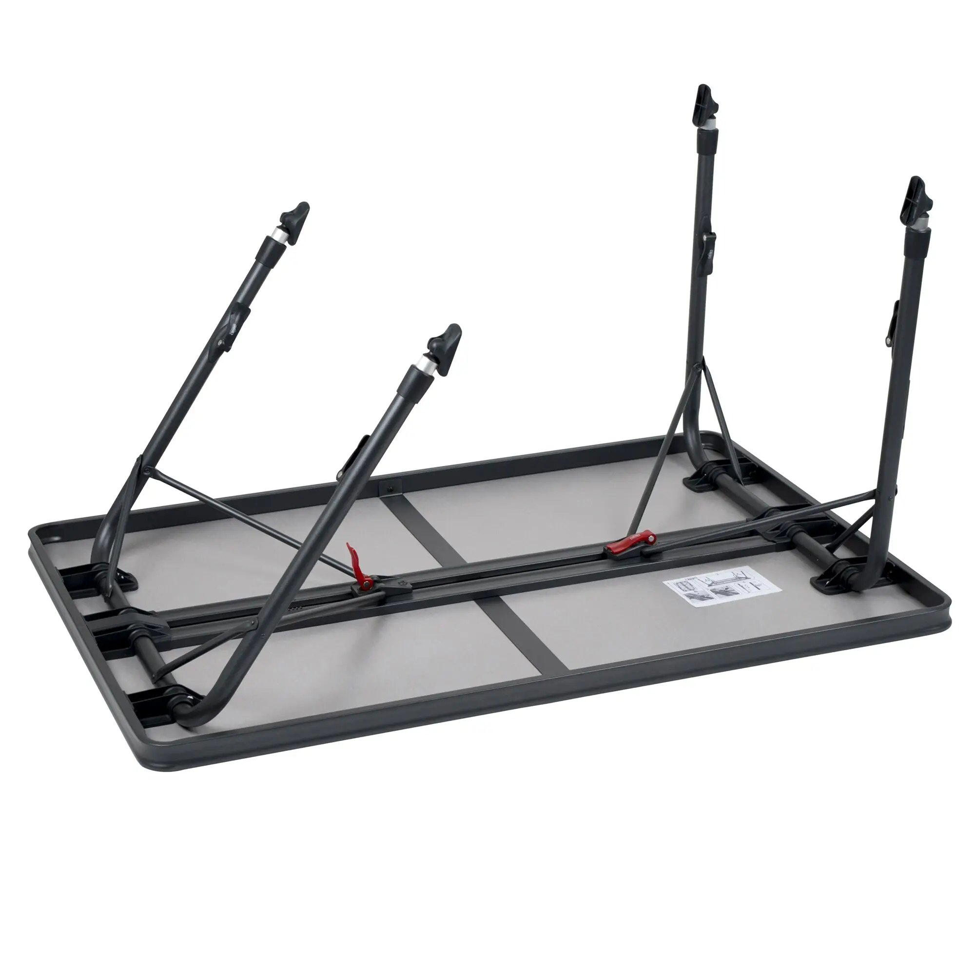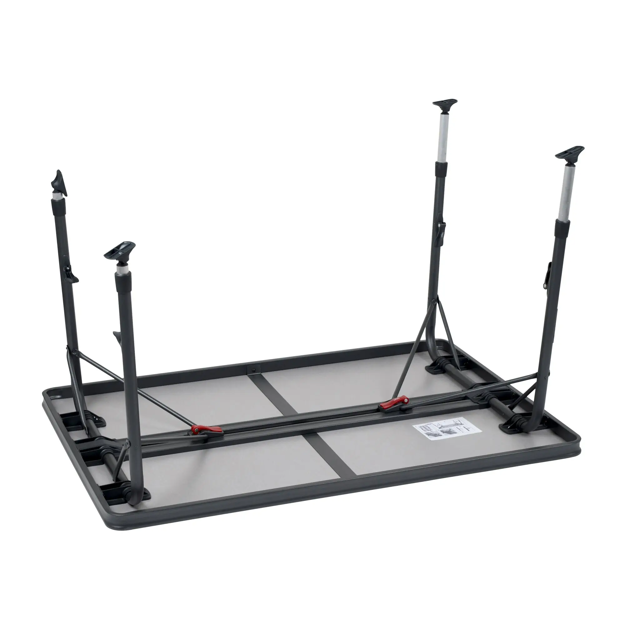 Light, folding camping table with durable melamine tabletop. The four reinforced, adjustable table legs with a diameter of 28 mm and the lateral struts ensure a secure stand on every ground. The fixing system is equipped with highly resistant sliding rails. The epoxy coating of the aluminium structure makes the table easy to clean and even more robust.