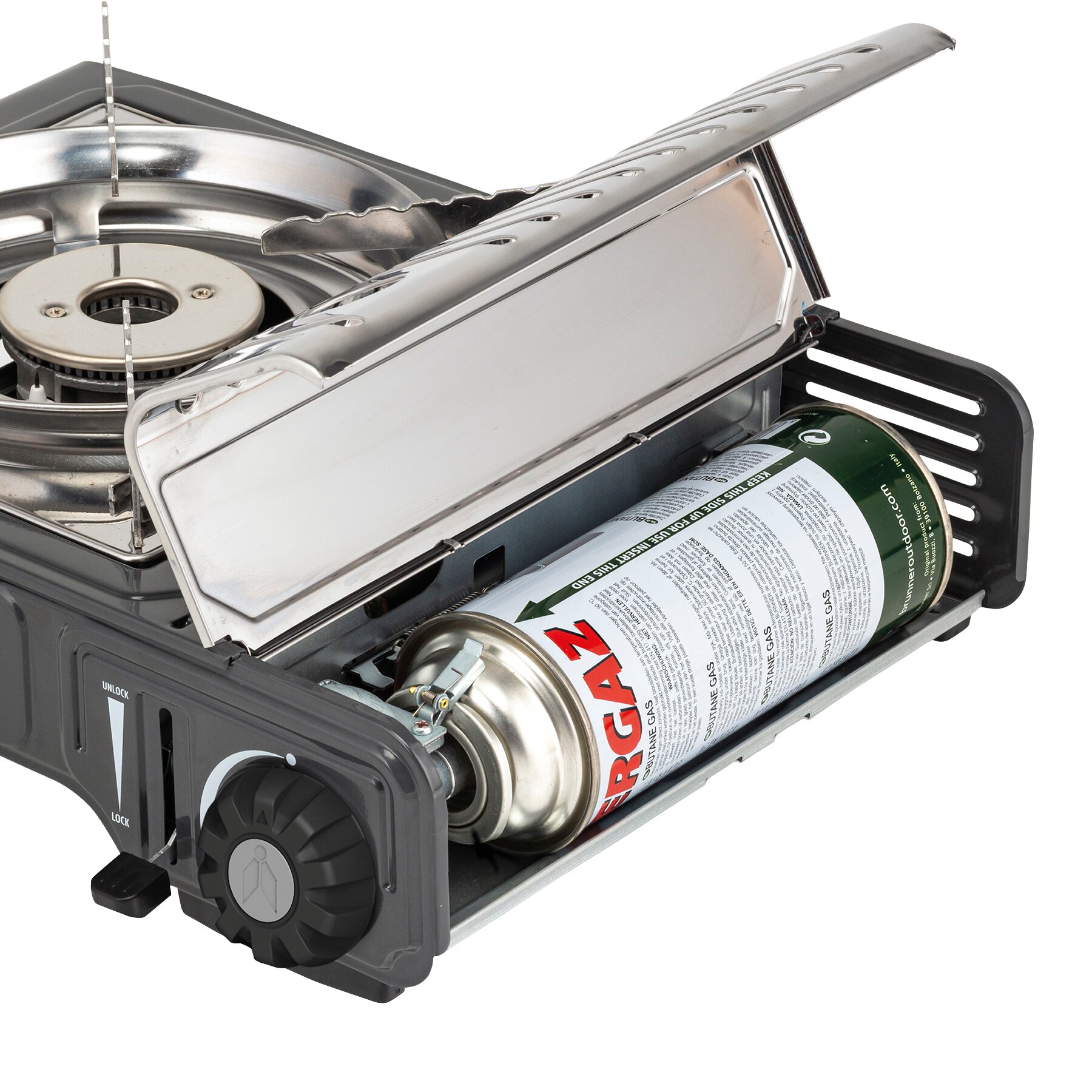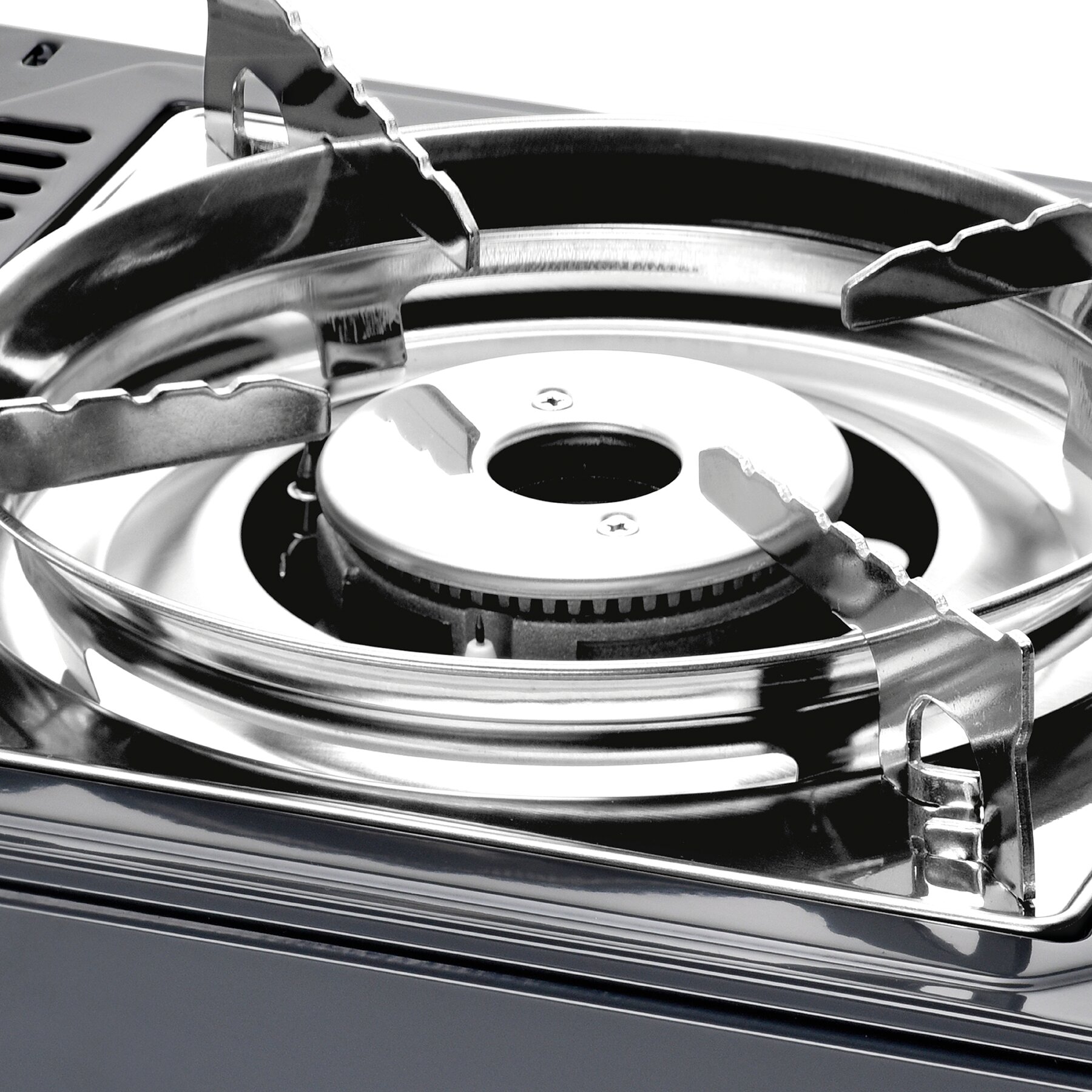 Cartridge gas stove with flame failure device, integrated piezo ignition and stainless steel burner. Gas flow can be regulated. Incl. transport case.