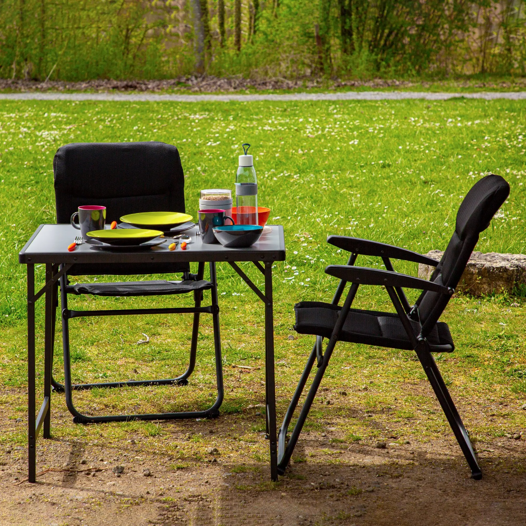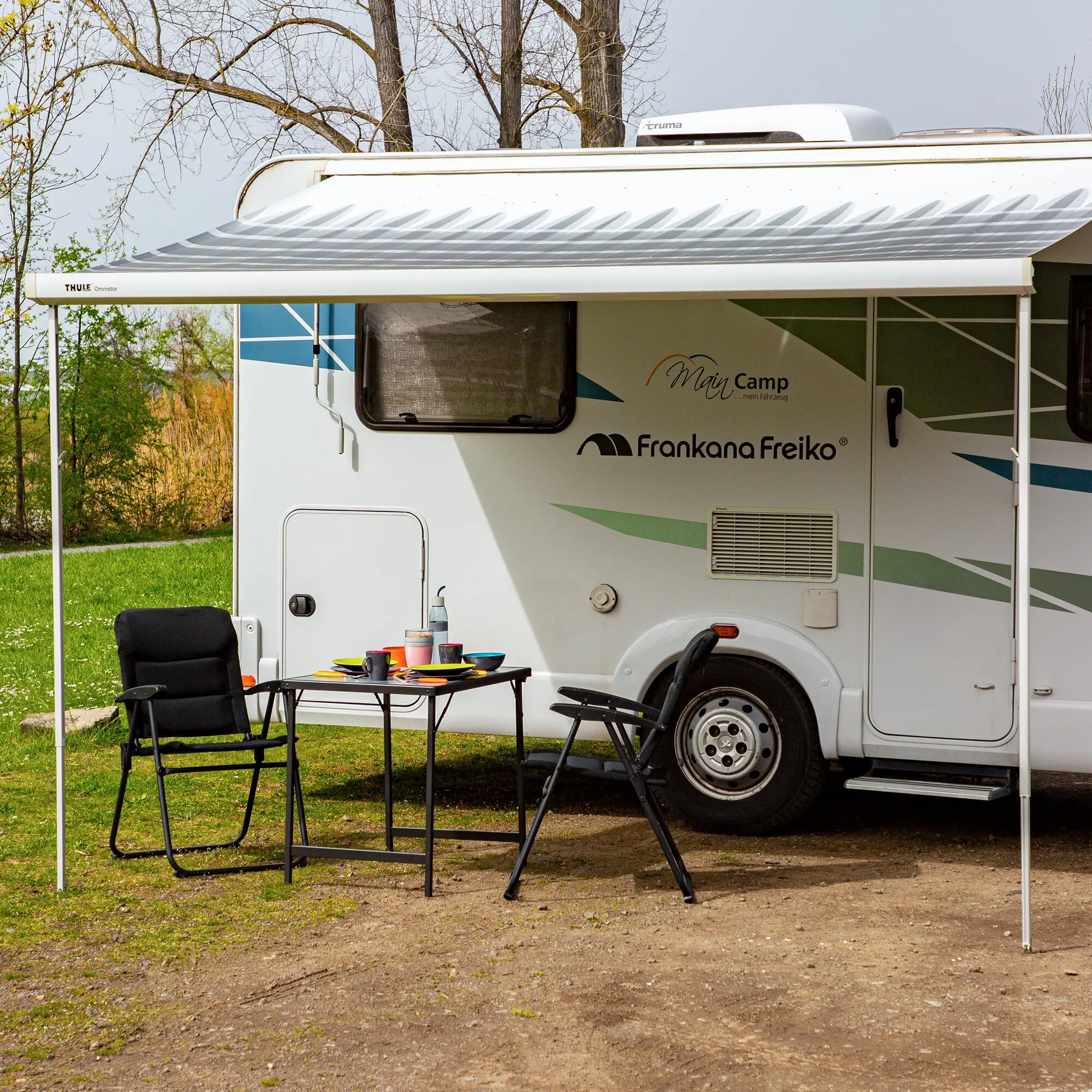 The Compact chair and table set is perfect for campers who do not have a lot of space in their recreational vehicle. The two foldable chairs and the camping table are stored in a convenient bag, so that you do not have to do without important equipment. The set does not only provide a place to eat, but also a place where you can sit together comfortably.