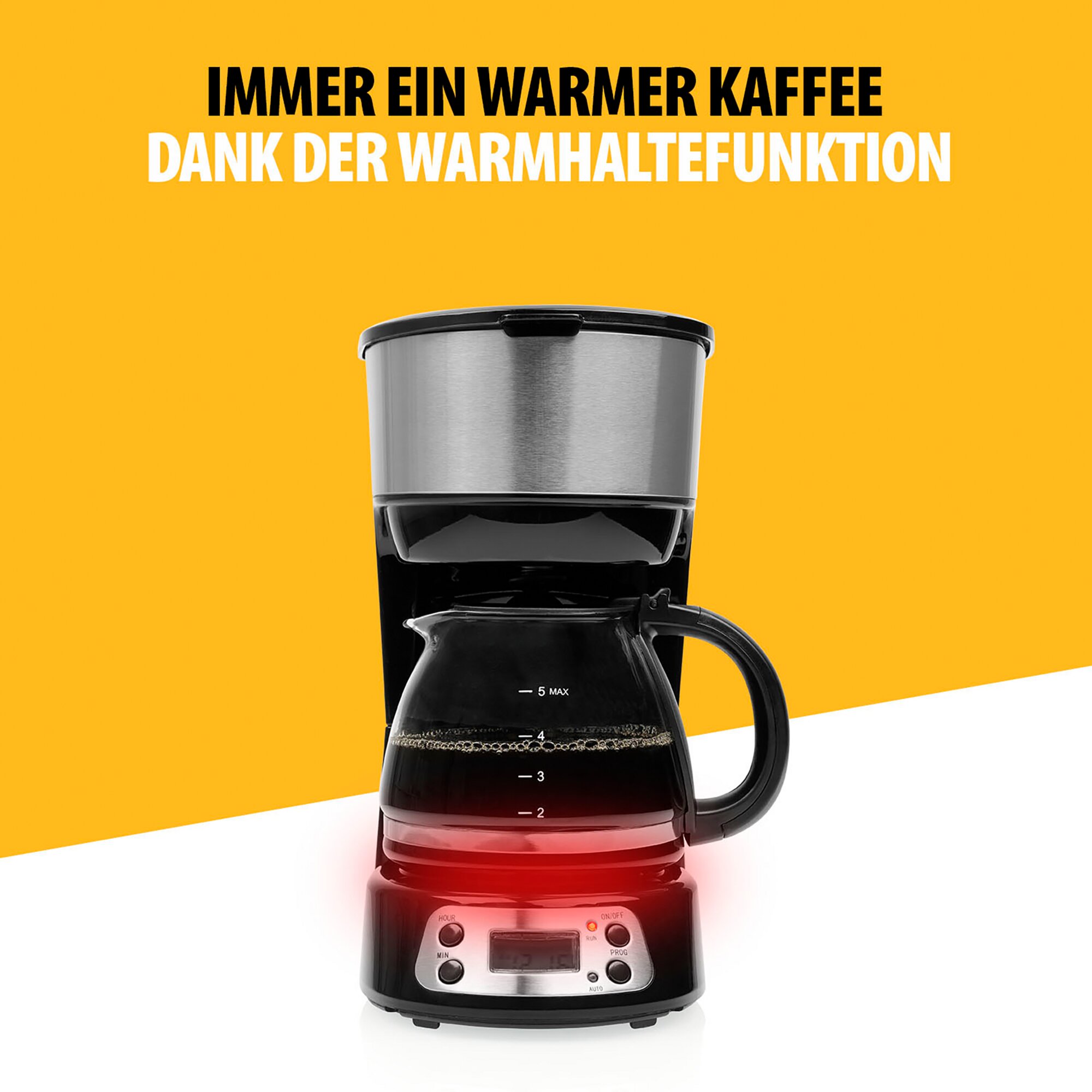 Enjoy fresh coffee at any time with this practical coffee machine, which features a built-in timer. Perfect for 7 to 8 cups, it provides enough coffee for family or guests. The elegant stainless steel design, robust glass carafe and warming plate make it particularly convenient and a stylish accessory in your kitchen. Suitable for brewing with ground coffee, it allows you to effortlessly enjoy aromatic coffee at any time of the day.