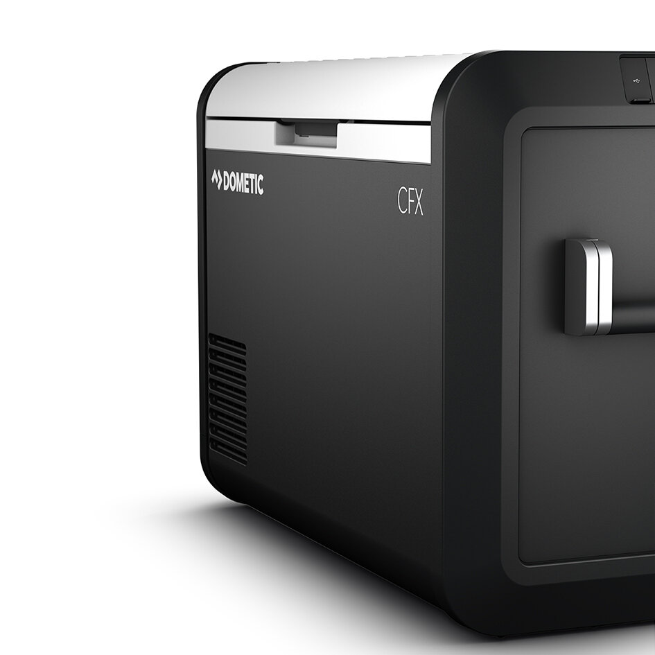 The Dometic CFX3 series coolers set a new standard in mobile refrigeration and freezing. Fresh food and chilled drinks at any time – Dometic’s market-leading VMSO3 cooling technology makes it possible. At the heart of the boxes are the speed-controlled compressors with optimised software for powerful refrigeration and deep-freezing with superior energy efficiency. The temperature can be set on the designed integrated TFT control panel or via CFX app from a smartphone or tablet PC via Bluetooth or WLAN. The CFX3 is equipped with a light and robust protective frame, making it ideal for outdoor use. Sturdy, spring-mounted aluminium handles make lifting and transporting easier.