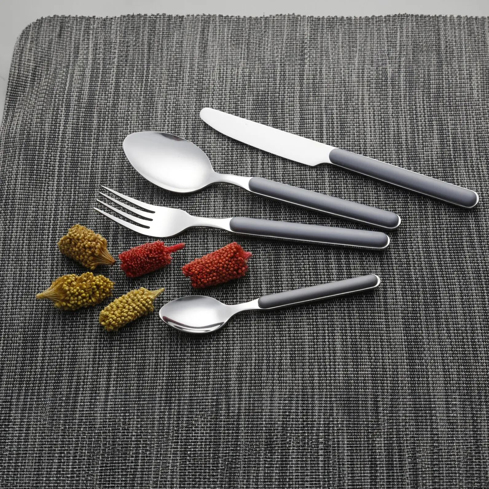 Sixteen-piece cutlery set made of solid, rustproof stainless steel. With nicely shaped plastic handles. Dishwasher-safe.