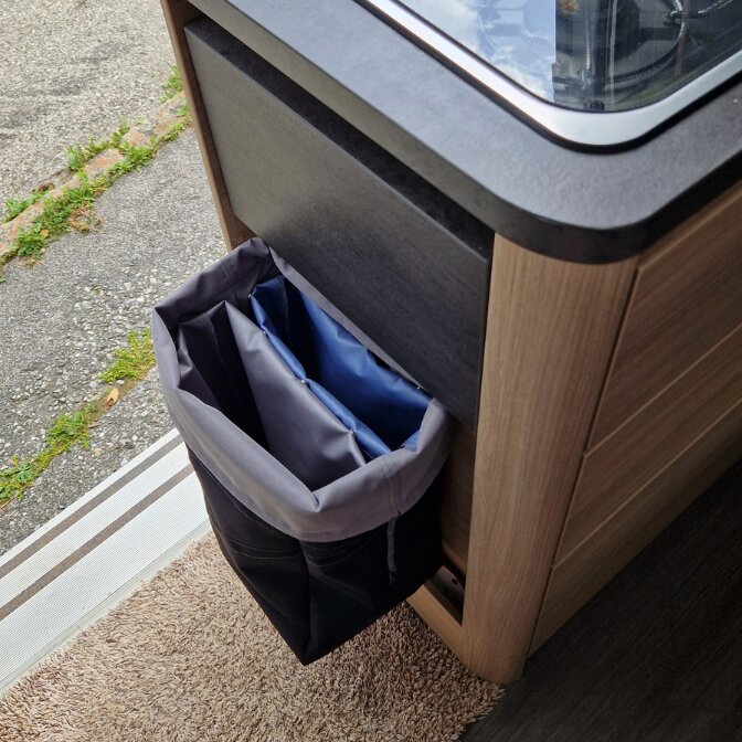 The XL model offers a generous capacity of 16 litres and makes waste separation easy directly in the vehicle. Packaging, paper and plastic waste can be cleanly separated, significantly simplifying disposal while travelling. The practical internal division prevents clutter and ensures optimal use of storage space.