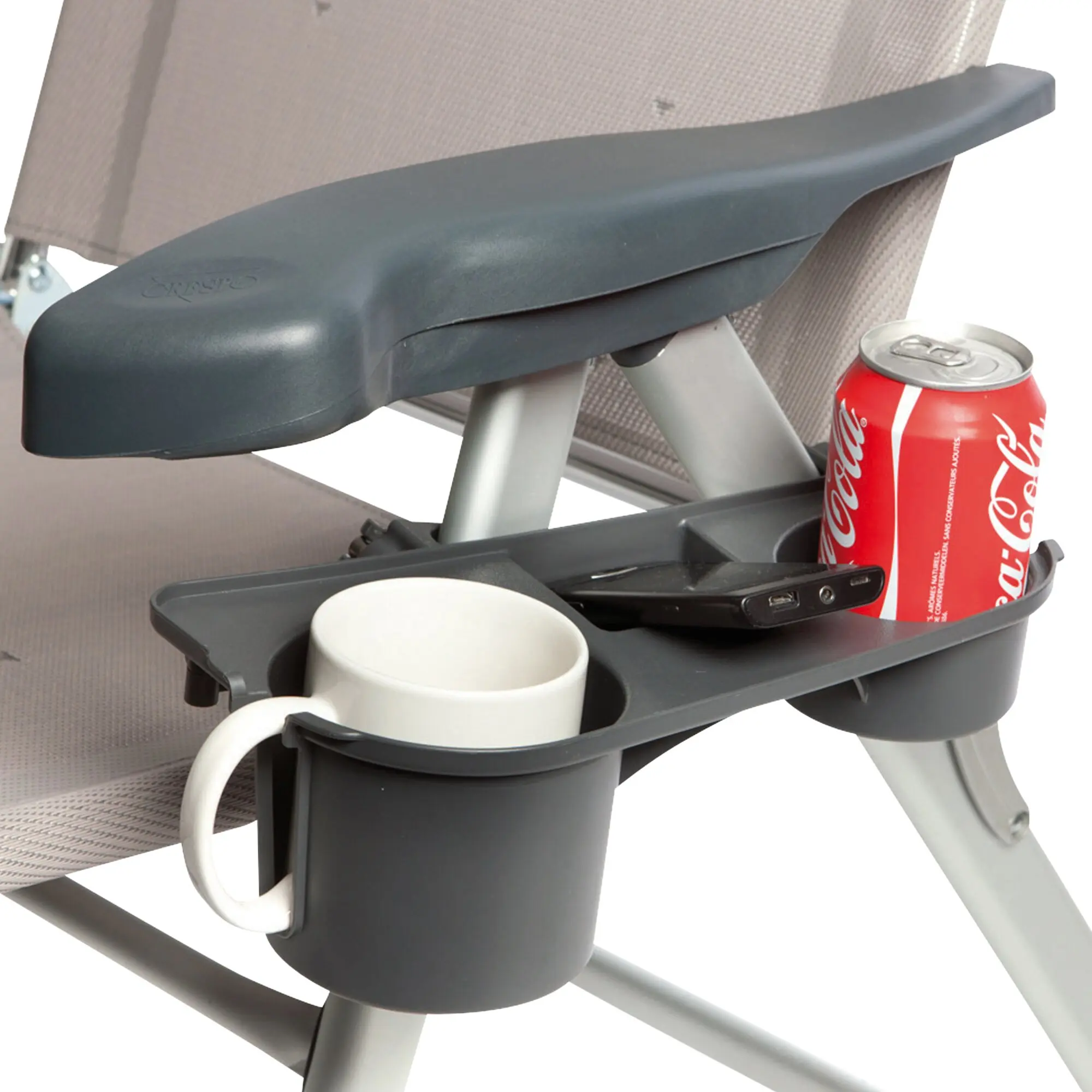 This sturdy drink holder can be attached to almost any adjustable folding chair thanks to its clever design. It provides space for cups, bottles or snacks and keeps everything within easy reach. Lightweight and space-saving. Ideal for camping, garden or beach.